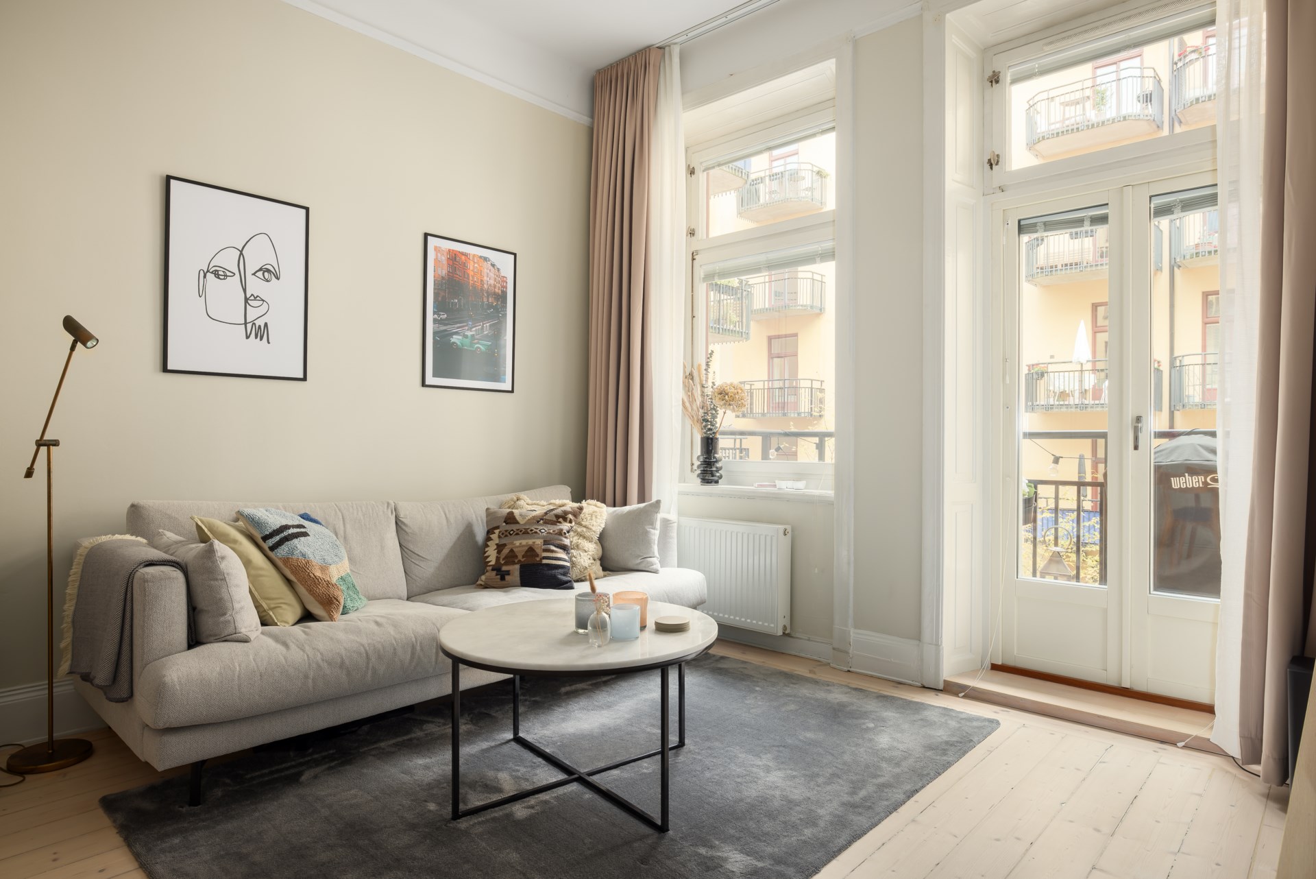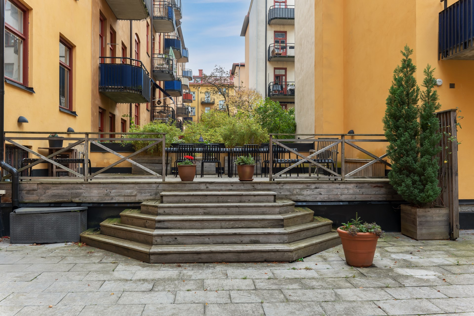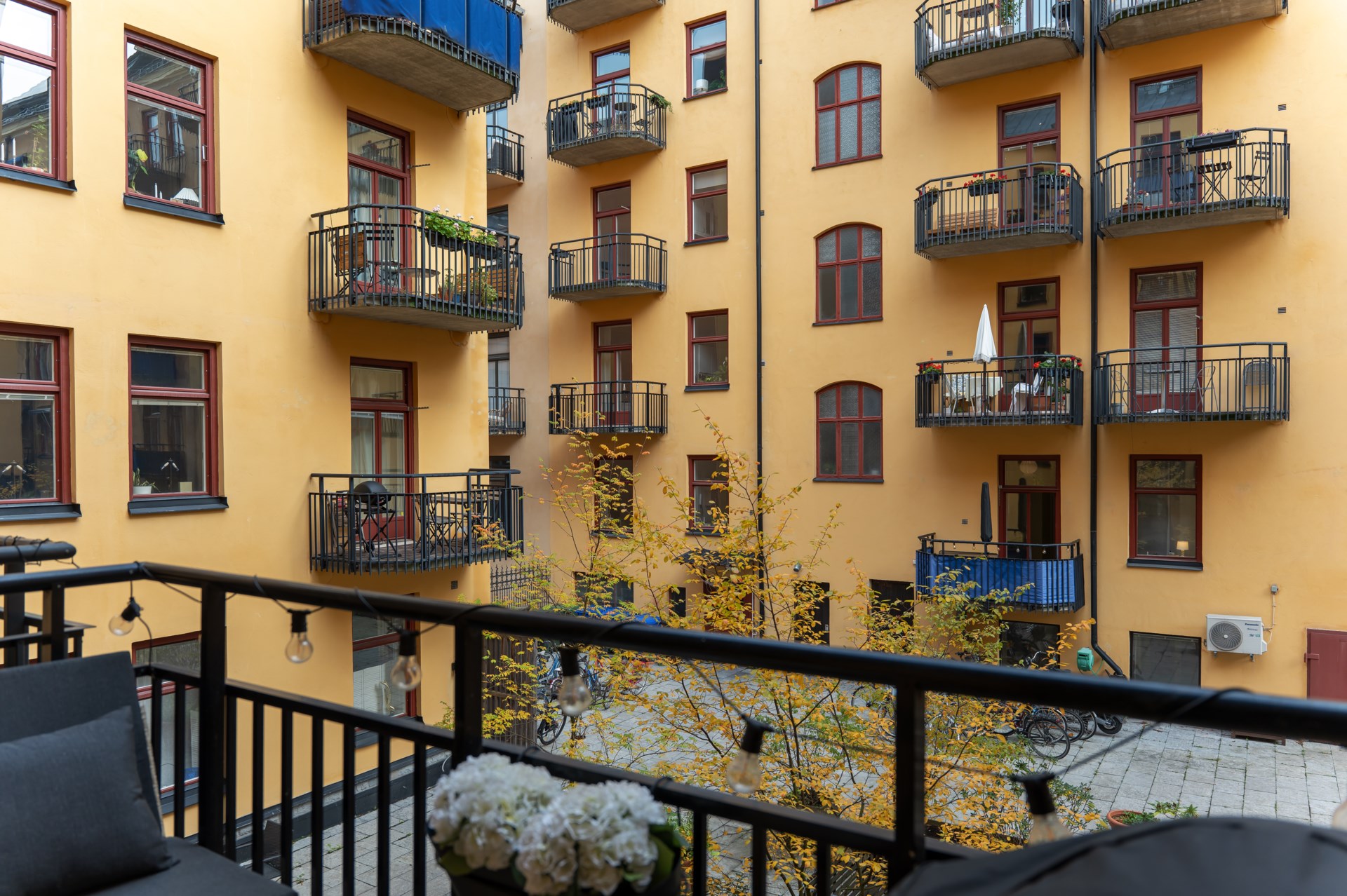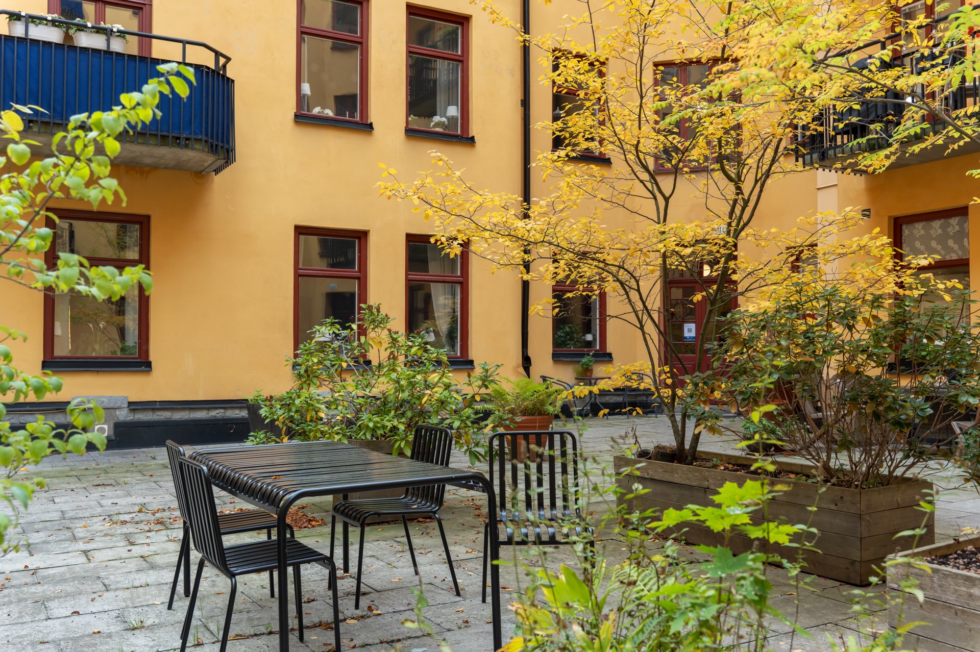 | Gemensamma utrymmen | Föreningens gemensamma utrymmen består av en stor och lummig innergård med utemöbler och grill. Gemensam tvättstuga finns i källarplan och är utrustad med tvättmaskin, torktumlare och torkskåp. Finns även cykel- och barnvagnsrum. |