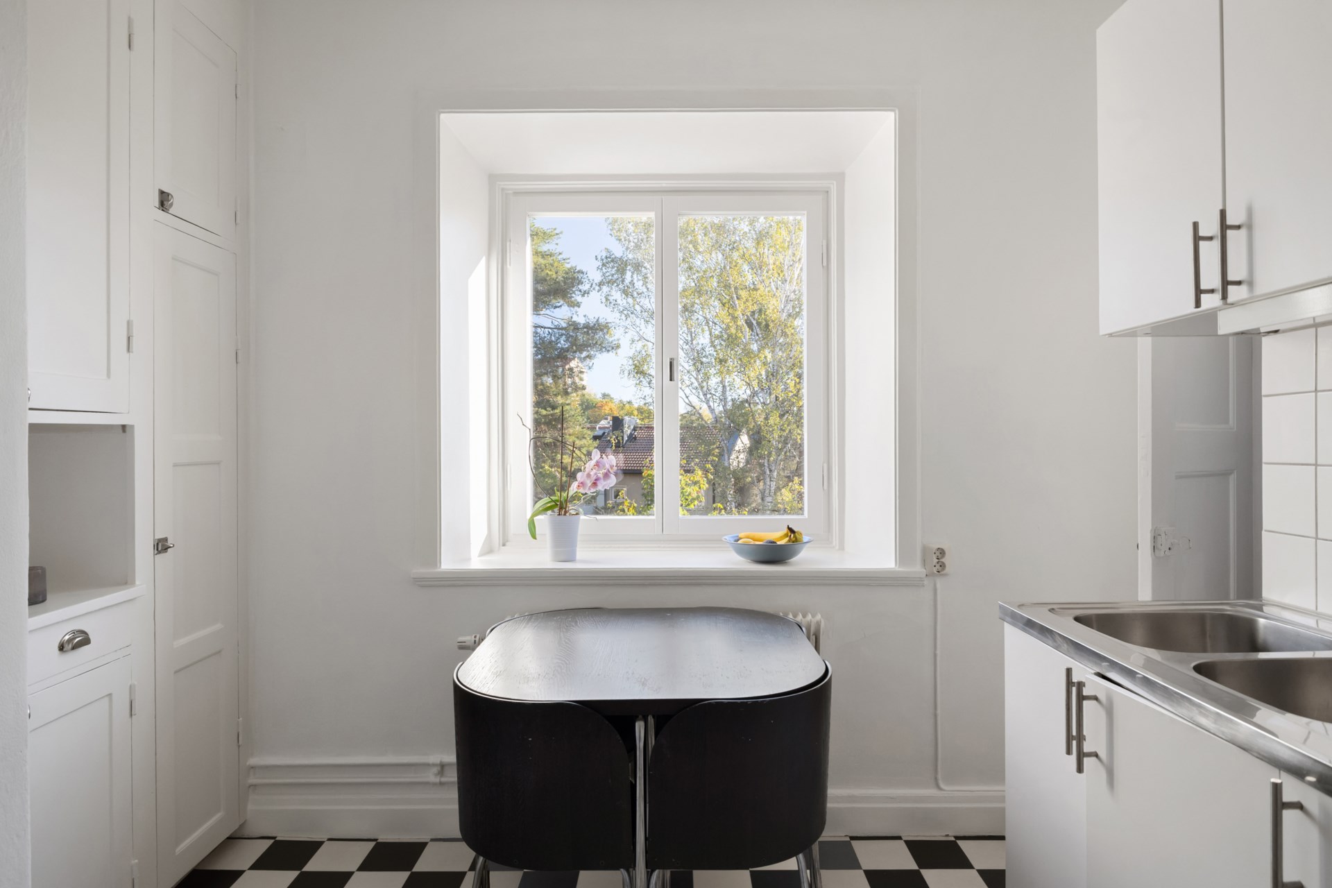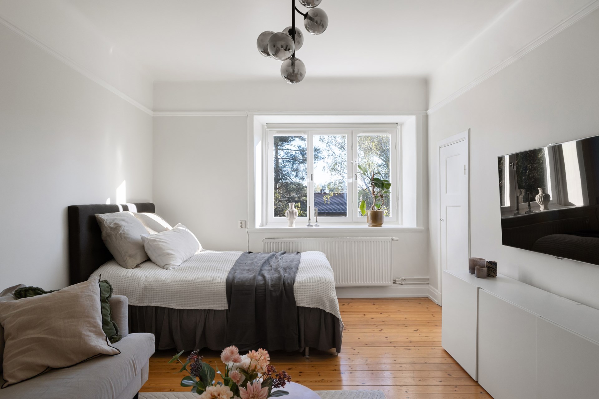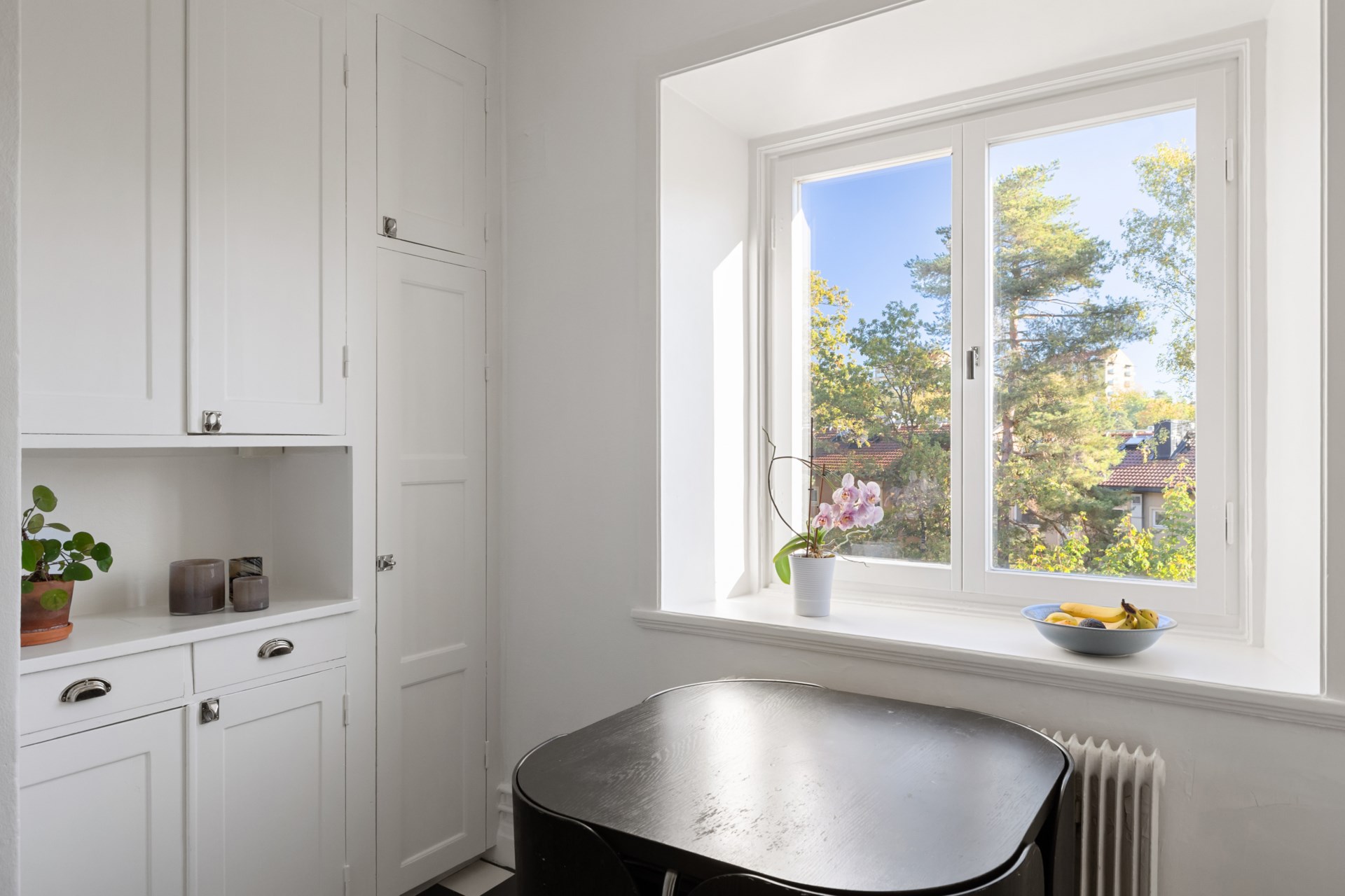 Bostaden bjuder på tidstypiska originaldetaljer såsom högt i tak, djupa fönsternischer och bevarade snickerier som skapar en varm och inbjudande atmosfär. Det stora vardagsrummet får rikligt med ljusinsläpp och har gott om plats för både soffgrupp och sänglösning. Rummet är rymligt och rofyllt, med utsikt mot en lummig grönska utan insyn. Här finns generöst med plats för dubbelsäng, nattduksbord och förvaring. Köket är charmigt och fräscht med bra arbetsytor och förvaring för den matlagningsintresserade. Badrummet är stambytt och stilrent med fina materialval och genomtänkt funktion. Den välkomnande hallen är rymlig och erbjuder utmärkta förvaringsmöjligheter direkt vid entrén.
