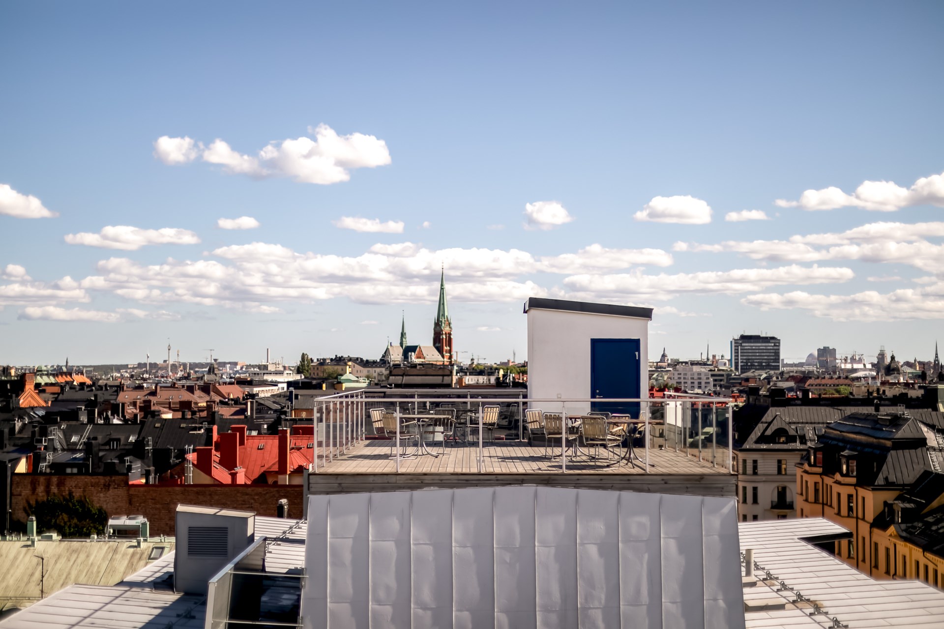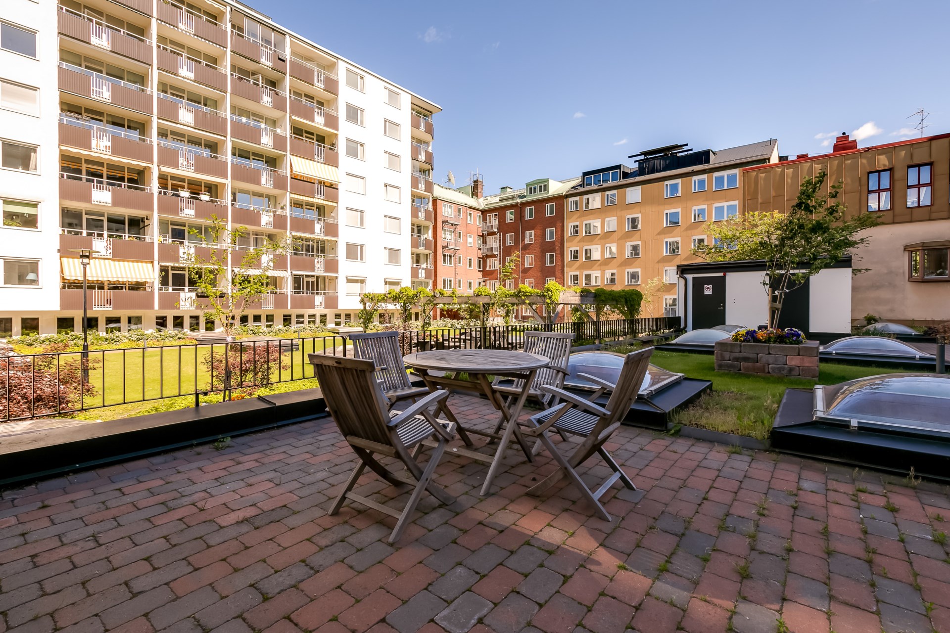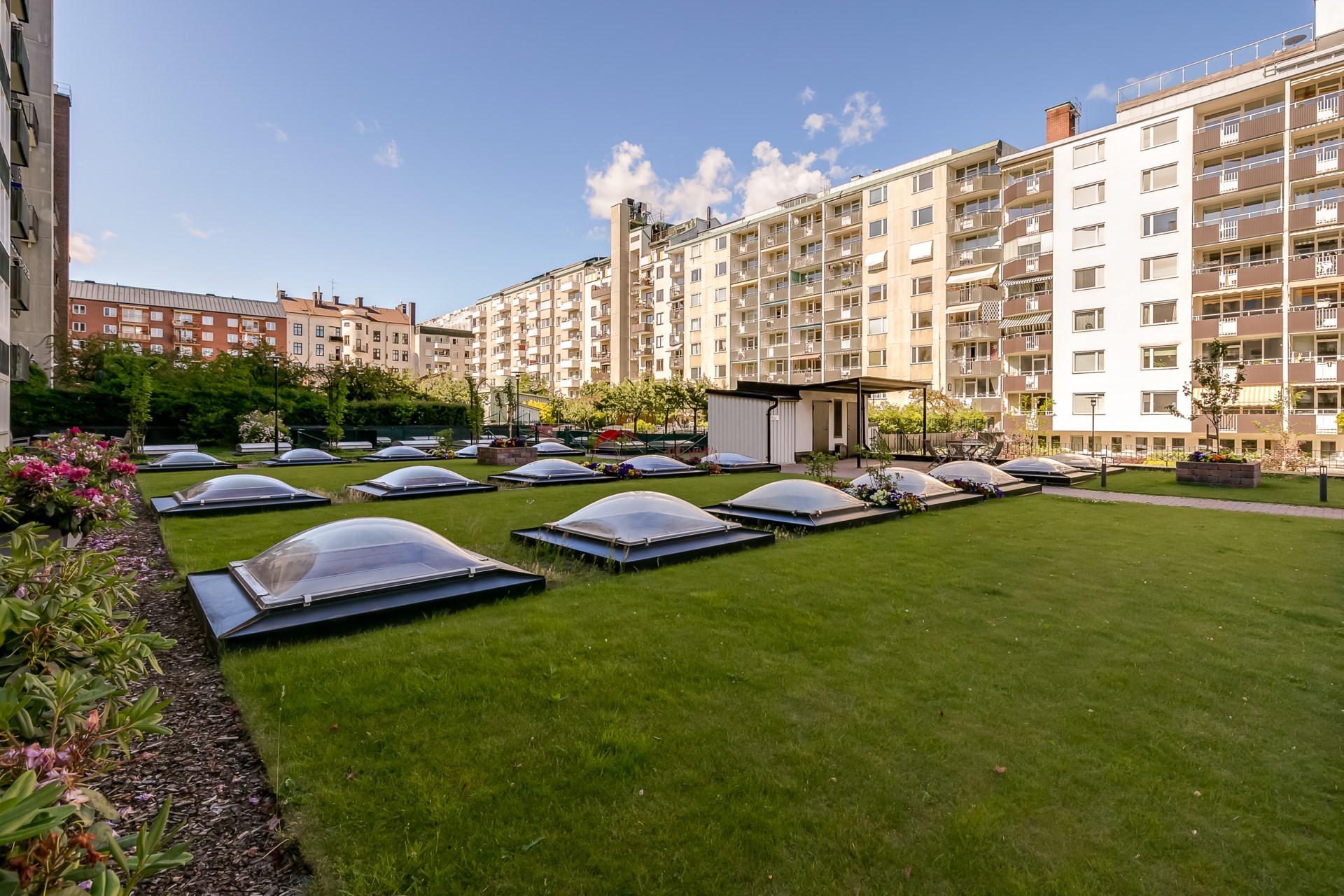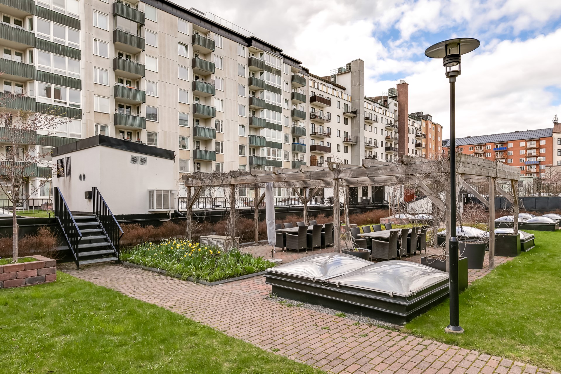 | Gemensamma utrymmen | I fastigheten finns även en bastulokal som kan bokas gratis av medlemmarna, tre takterrasser, övernattningsrum samt en fastighetsexpedition. |