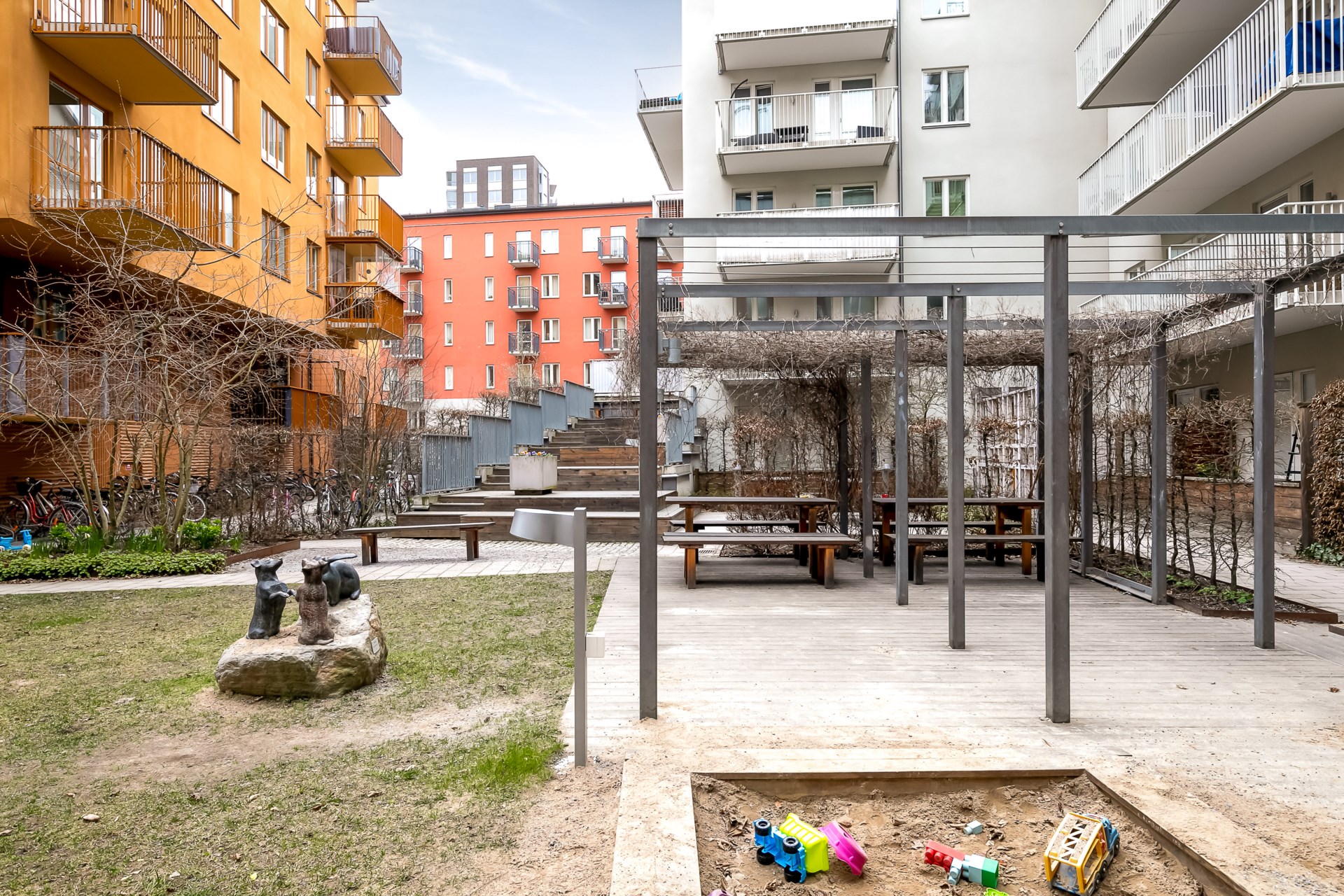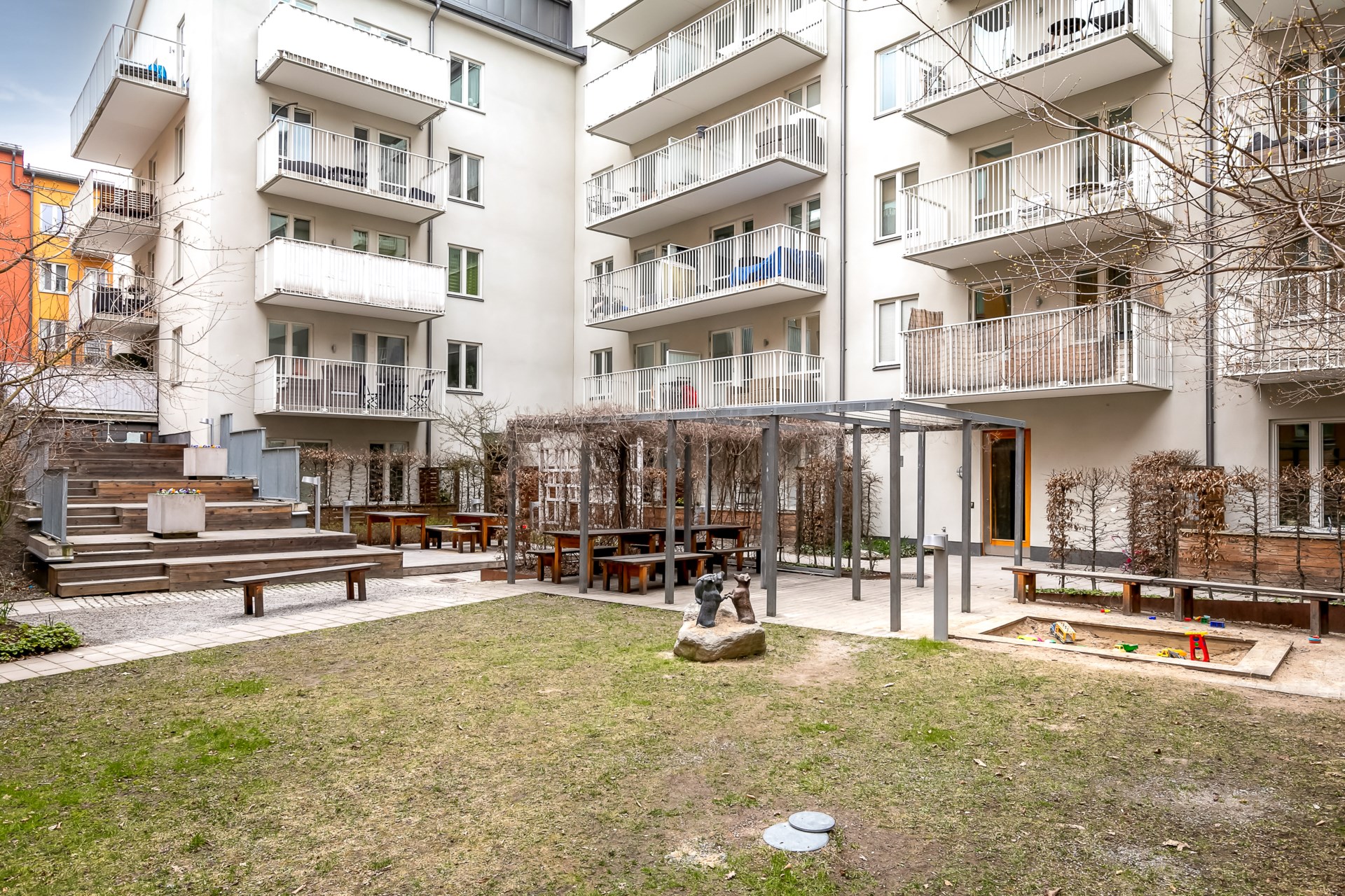 | Gemensamma utrymmen | I föreningen finns ett styrelserum som hyrs ut för övernattning (300 kr per dygn 2024), källsorteringsrum, lägenhetsförråd i källaren, cykelrum (9 st), barnvagns- och rullstolsrum (4 st). Till föreningen hör även en innergård med gemensam uteplats, lekyta och cykelparkering. Grovtvättstuga finns med en tvättmaskin, en torktumlare, ett torkskåp samt en mangel. Grovtvättstugan bokas mot en kostnad. |