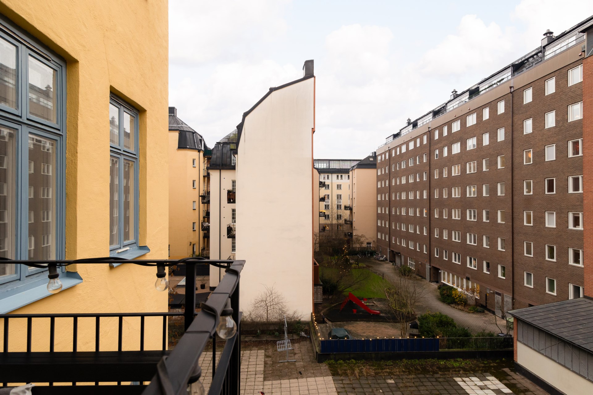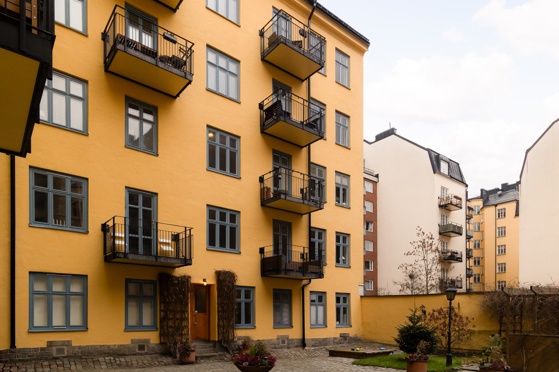 | Gemensamma utrymmen | Bastu, gården och tvättstuga, det finns förråd till alla lägenheter. Förråd för barnvagnar på gården. |