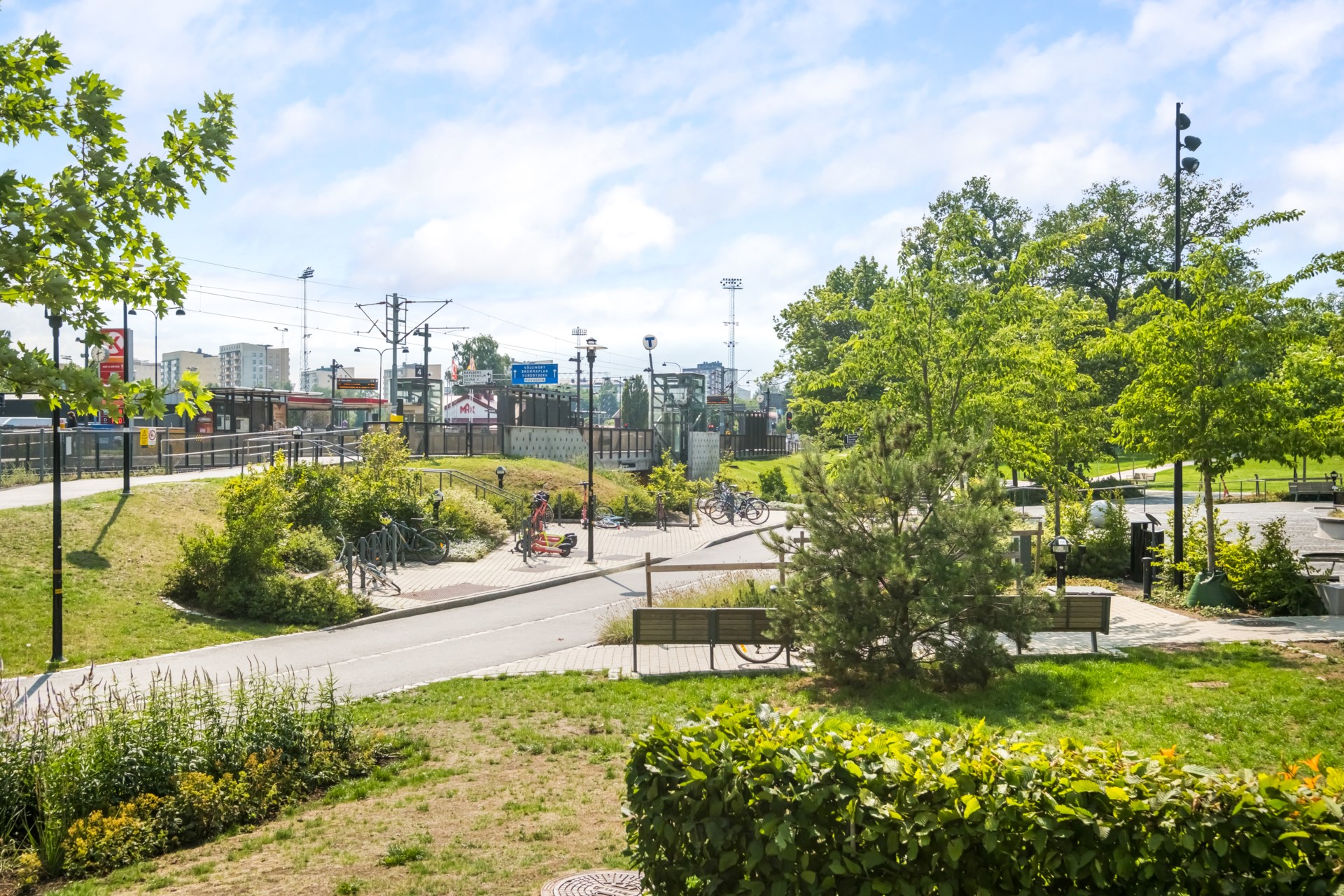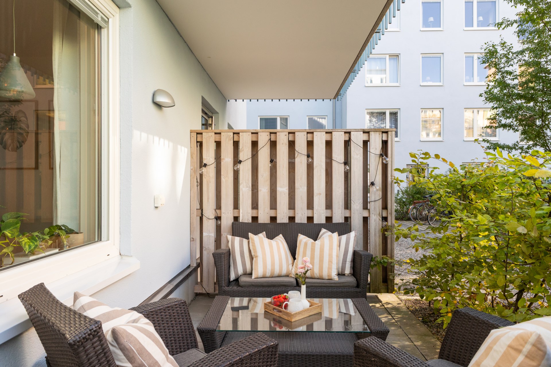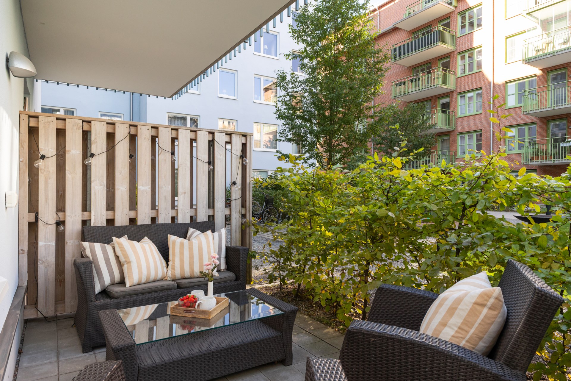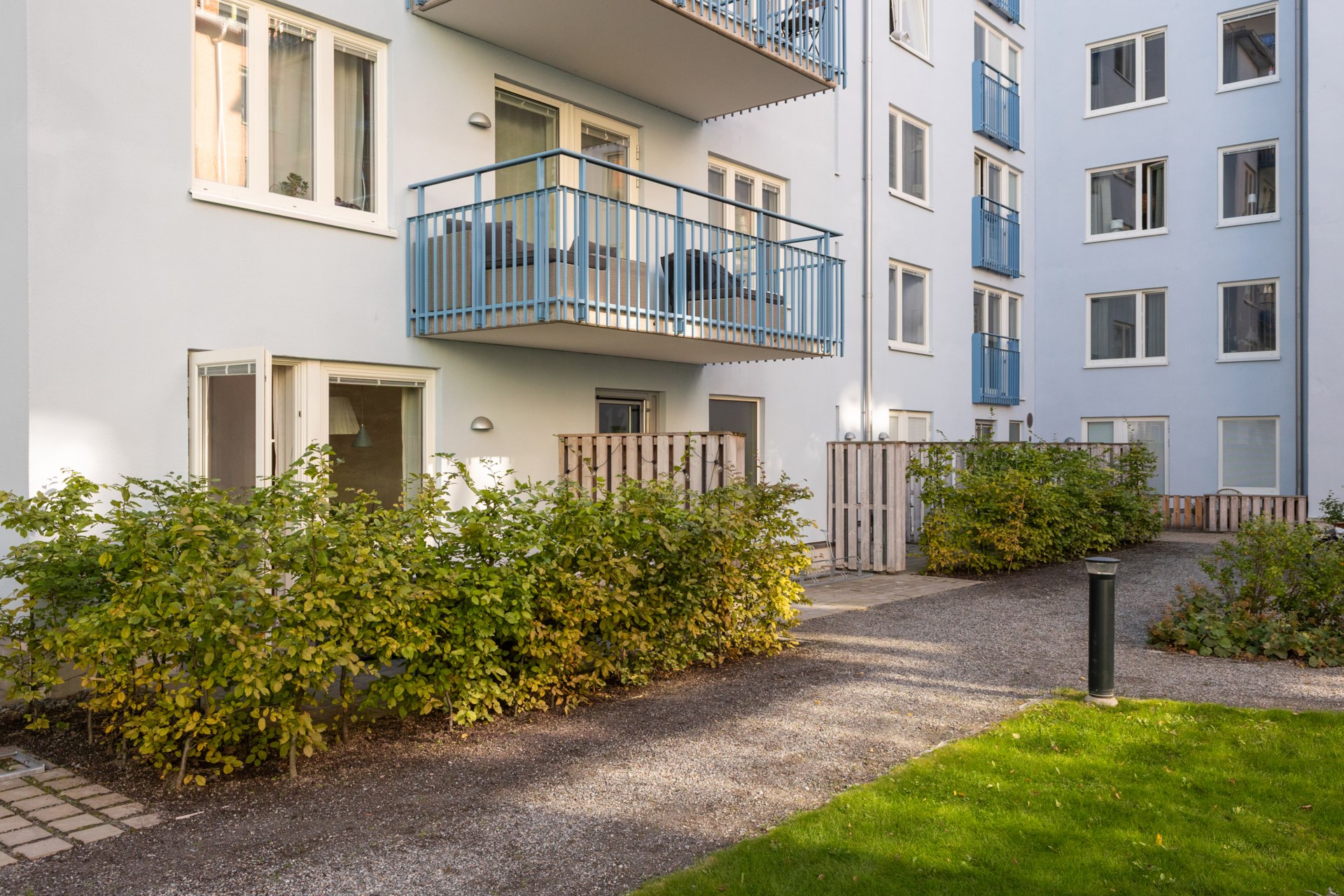 Gemensamma utrymmen Det finns 2 miljörum, 3 cykelrum samt förråd för barnvagnar, rullatorer och dylikt i varje trapphus. På den gemensamma gården finns cykelställ, soffor, sandlåda, utegrill och picknickbord under en pergola.