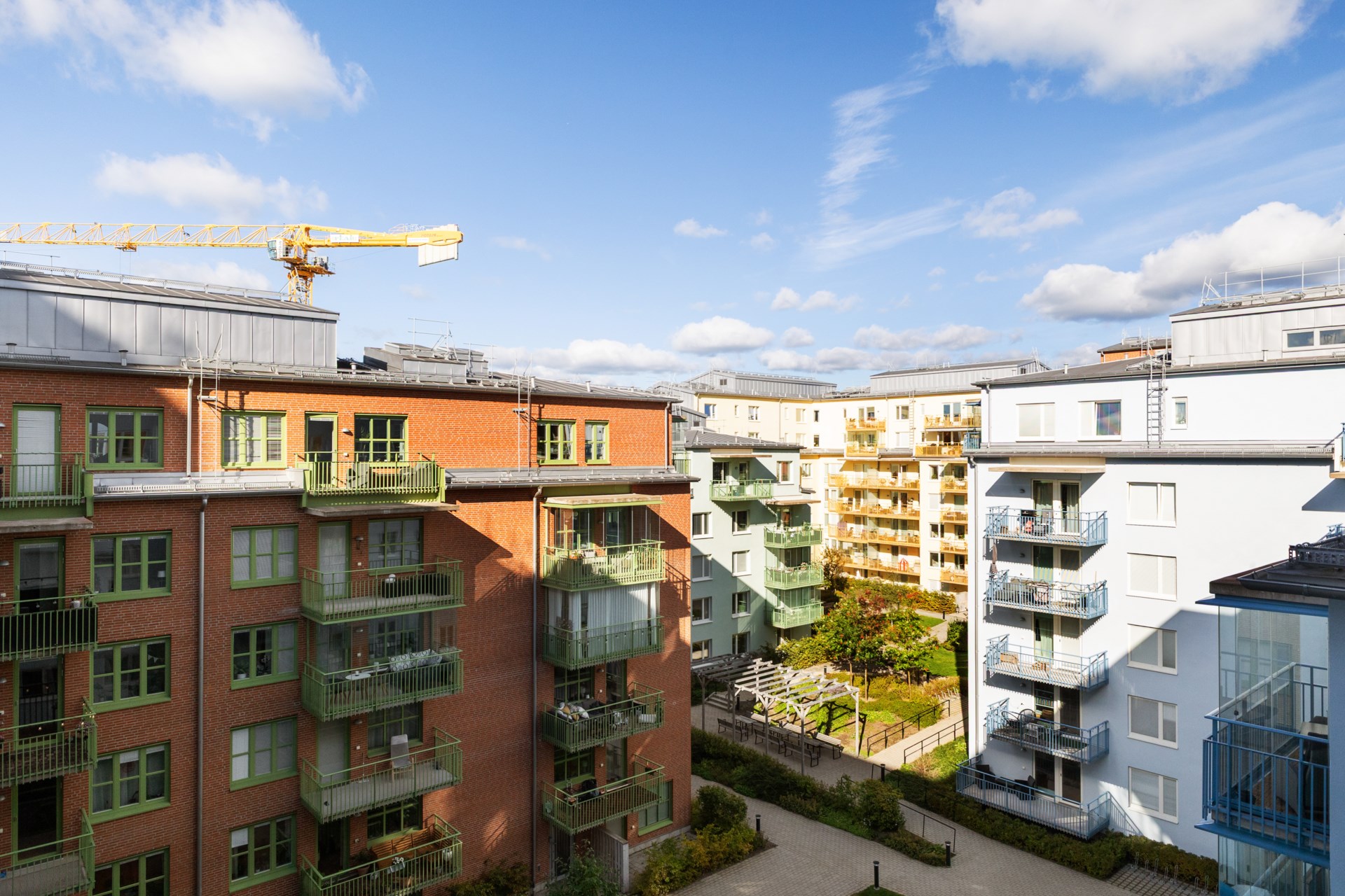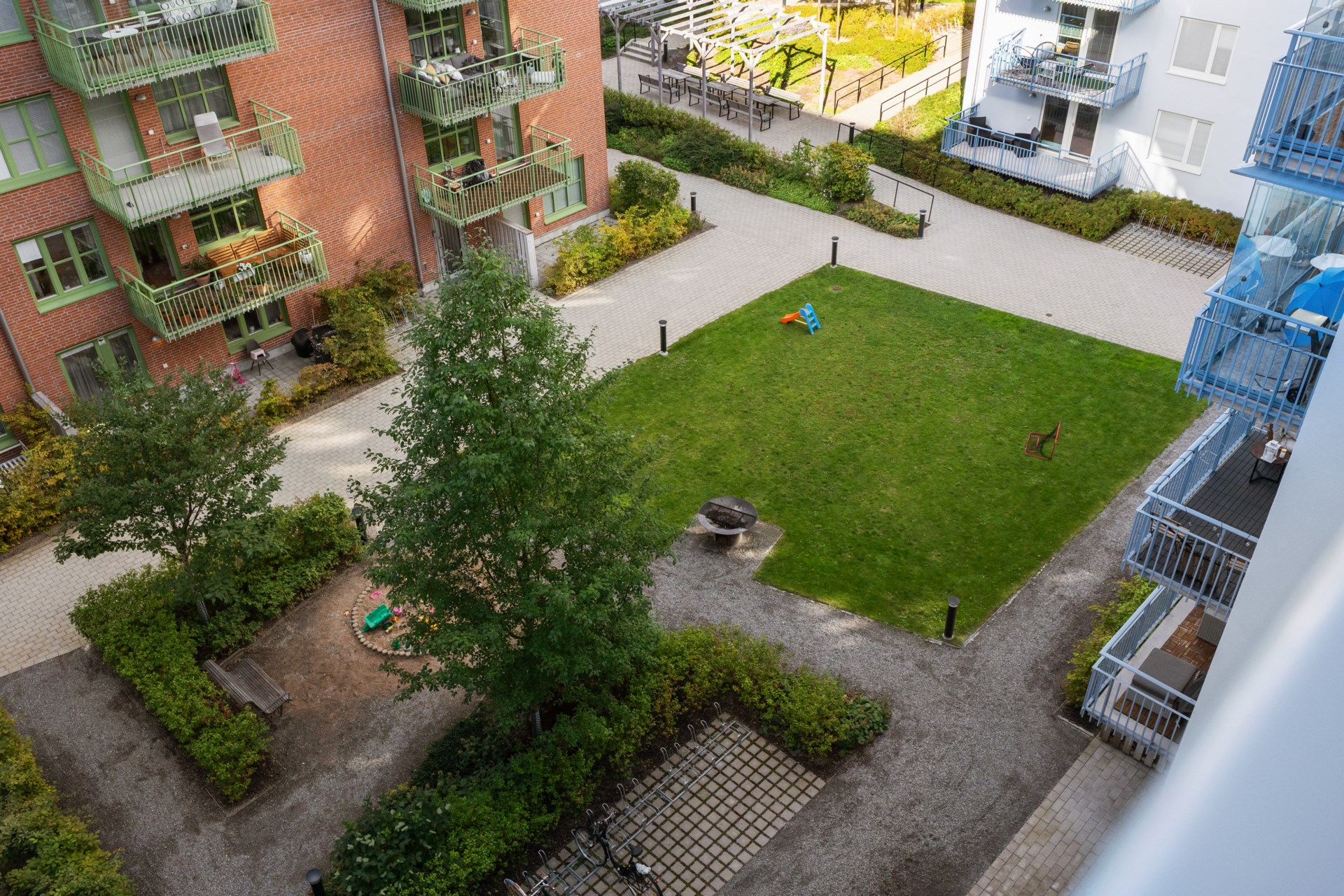 | Gemensamma utrymmen | Det finns 2 miljörum, 3 cykelrum samt förråd för barnvagnar, rullatorer och dylikt i varje trapphus. På den gemensamma gården finns cykelställ, soffor, sandlåda, utegrill och picknickbord under en pergola. |