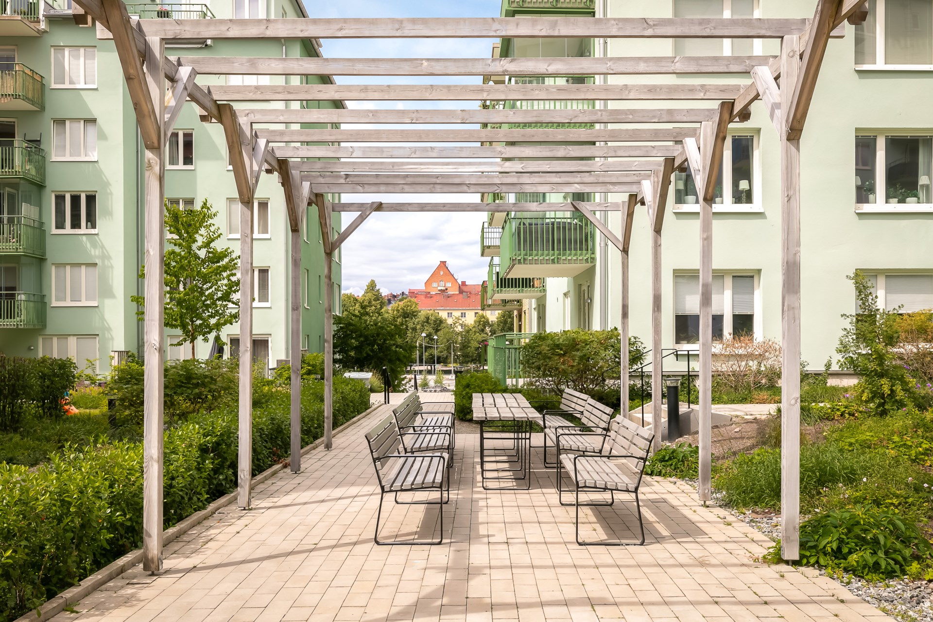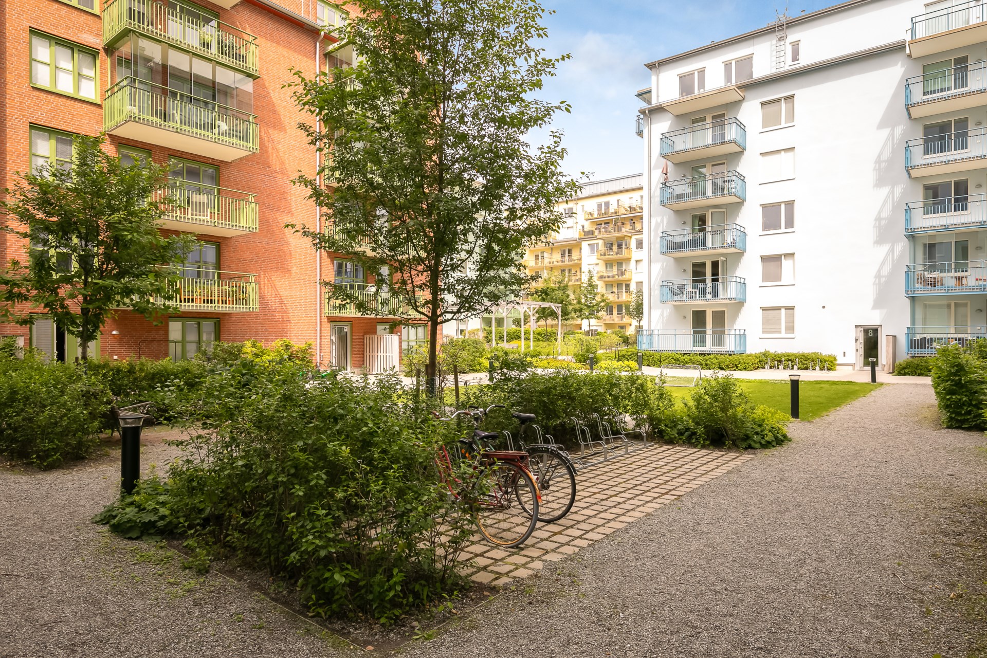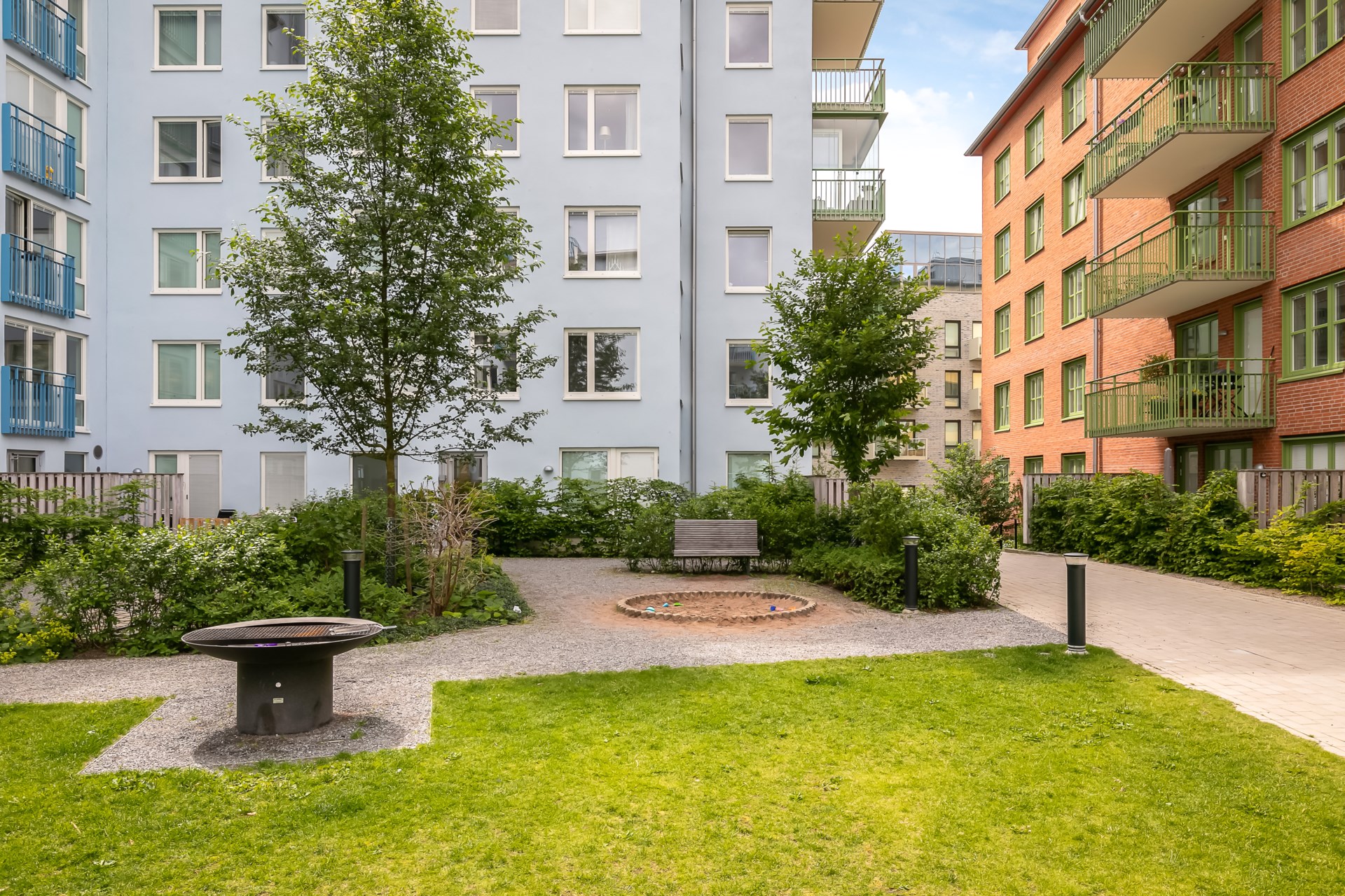 | Gemensamma utrymmen | Det finns 2 miljörum, 3 cykelrum samt förråd för barnvagnar, rullatorer och dylikt i varje trapphus. På den gemensamma gården finns cykelställ, soffor, sandlåda, utegrill och picknickbord under en pergola. |