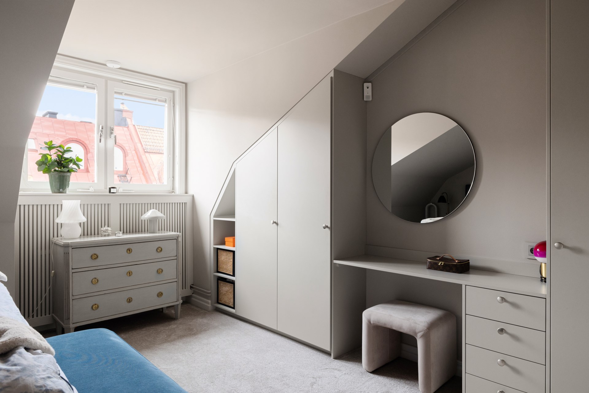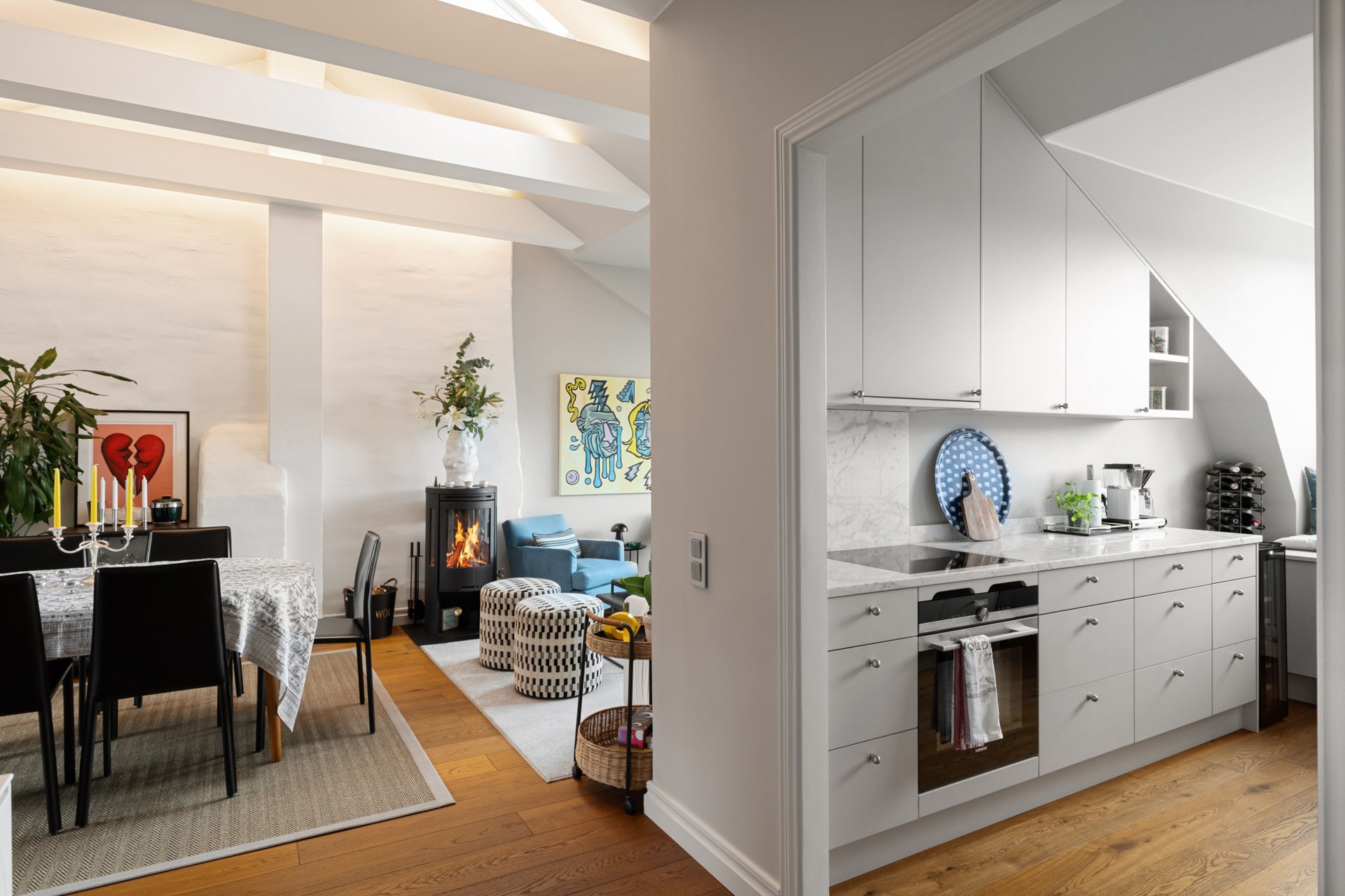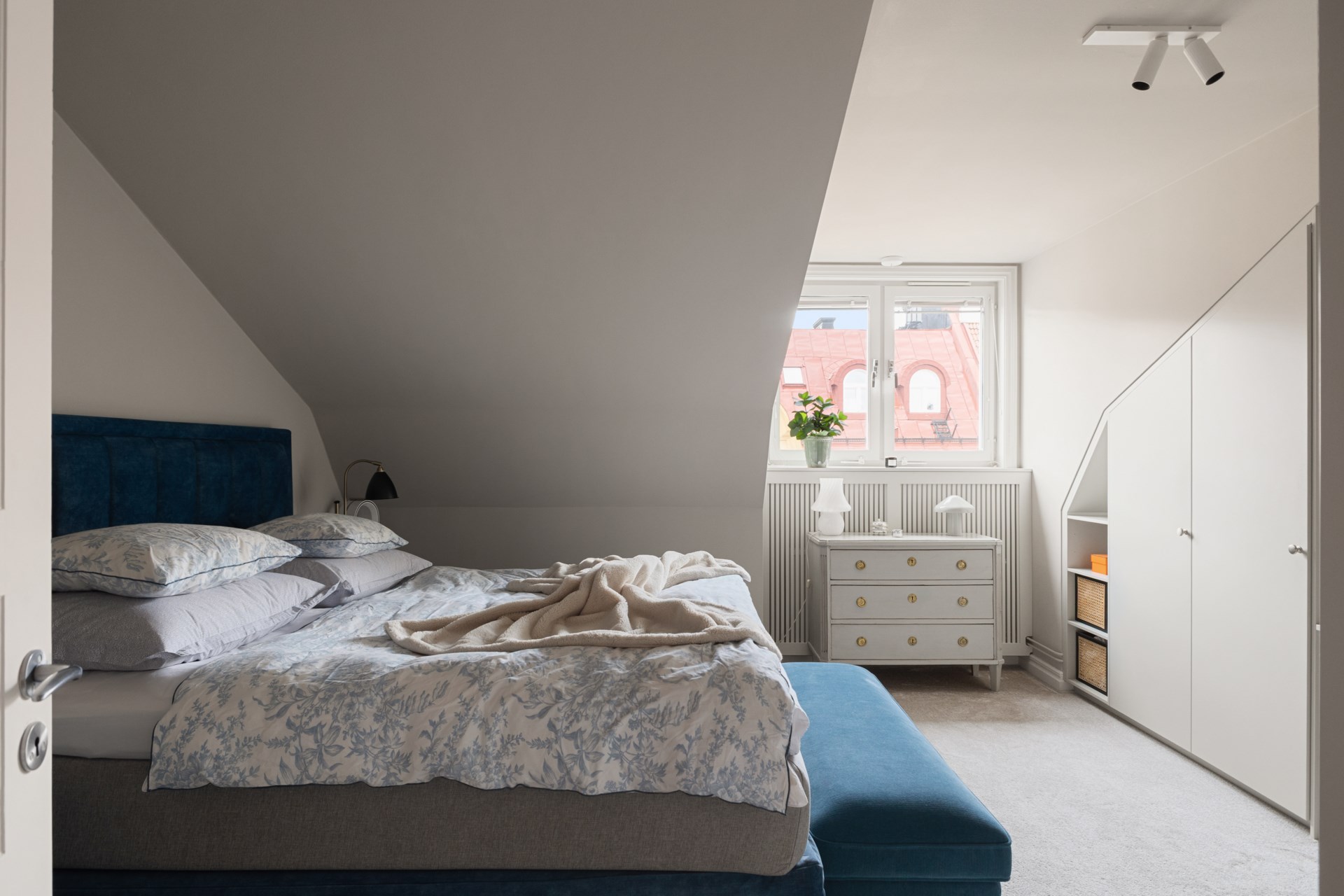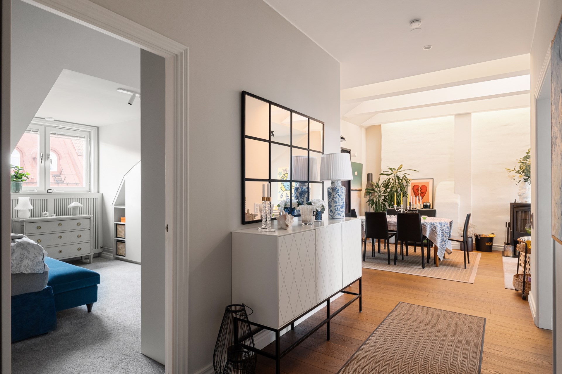 Högst upp i ett vackert sekelskifteshus på Gästrikegatan väntar ett hem med en ovanlig kombination av lugn, ljus och