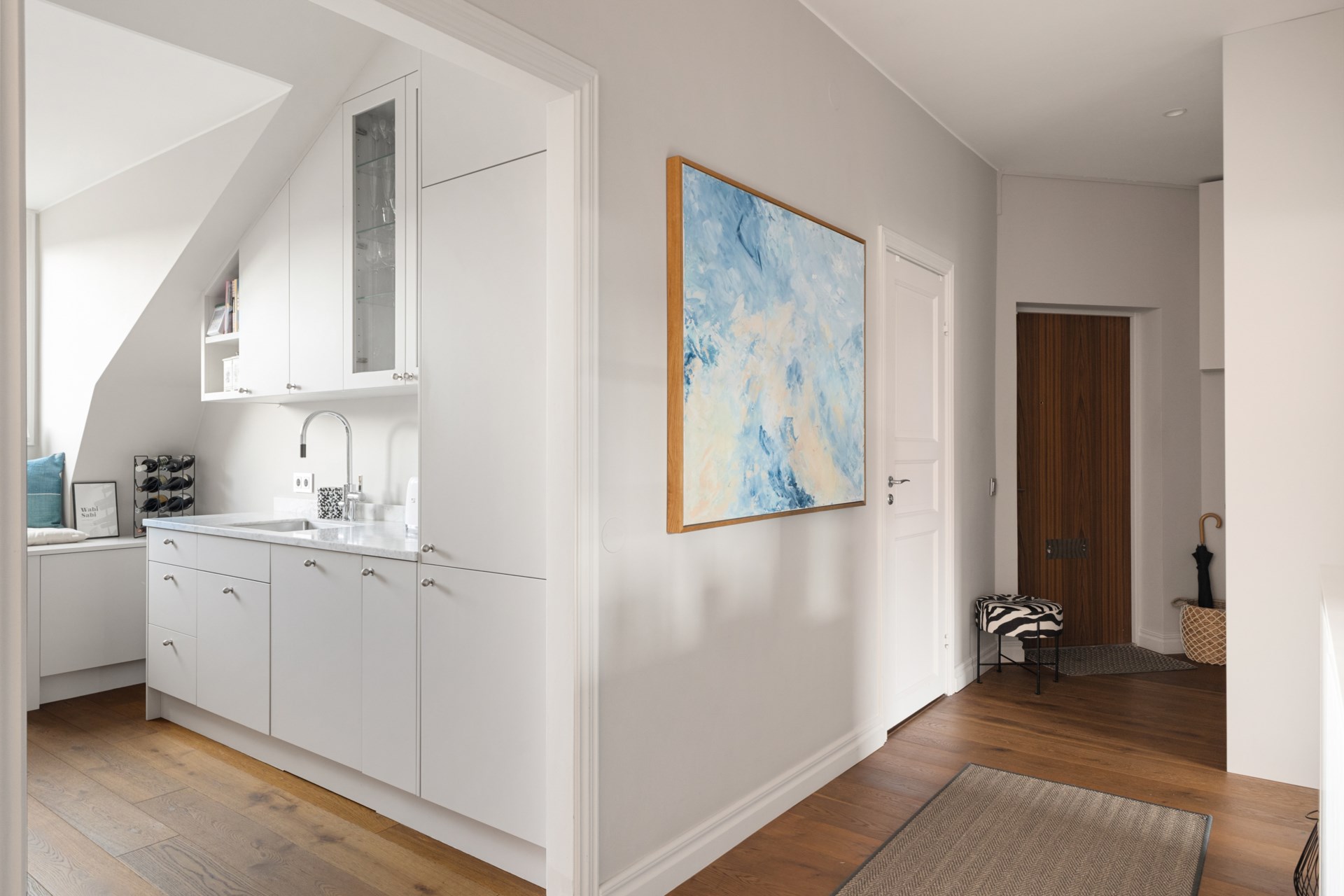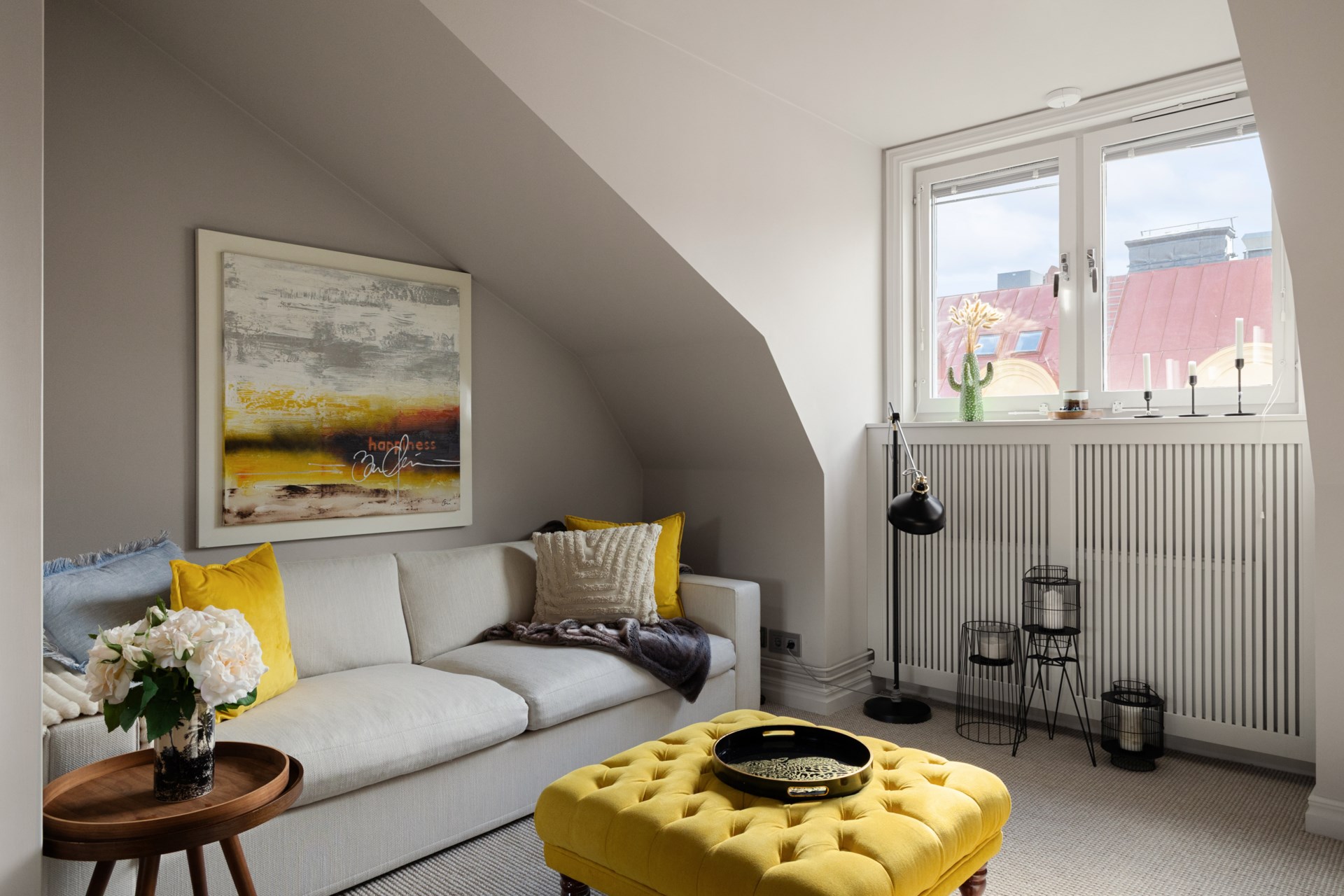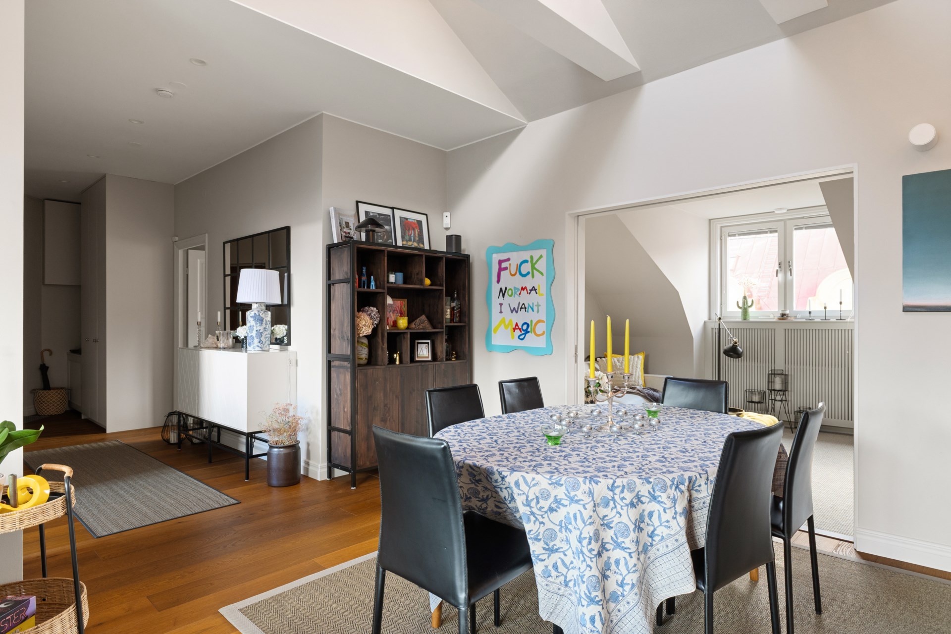 Högst upp i ett vackert sekelskifteshus på Gästrikegatan väntar ett hem med en ovanlig kombination av lugn, ljus och