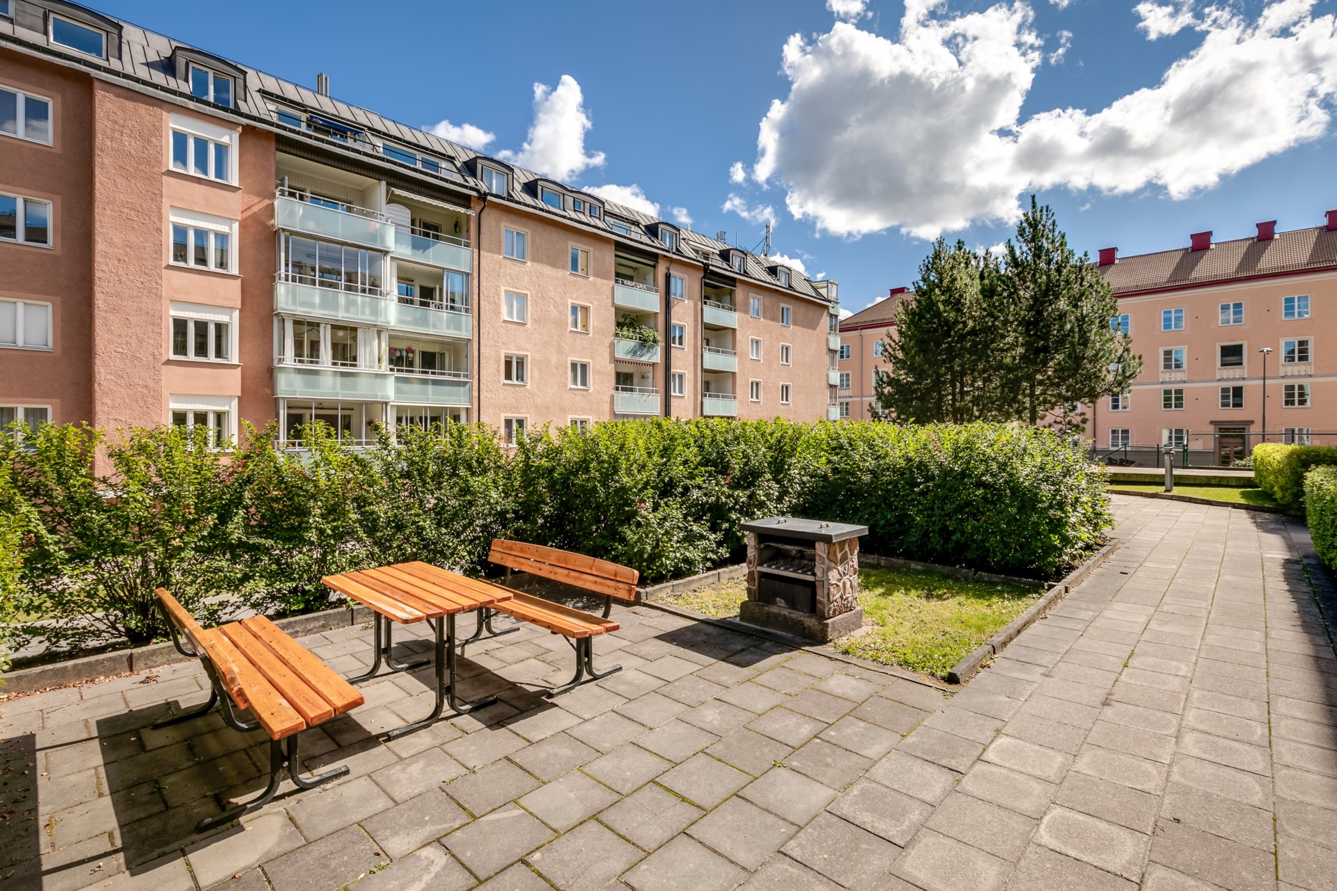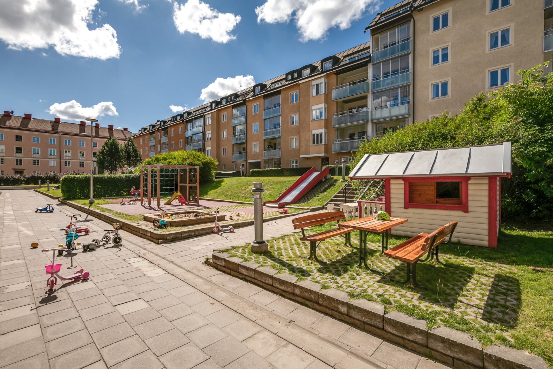 | Gemensamma utrymmen | Gästlägenhet, Fritidslokal, Hobbylokal, Boulebana ,Återvinningsrum Gård med grillplatser och Lekgårdar, Tvättstugor samt rum för barnvagnar och cyklar. |