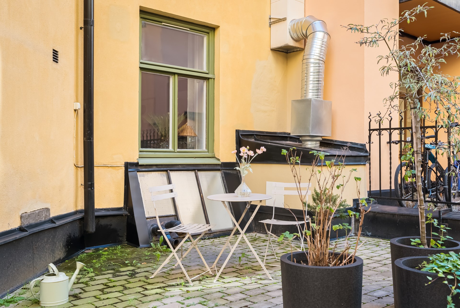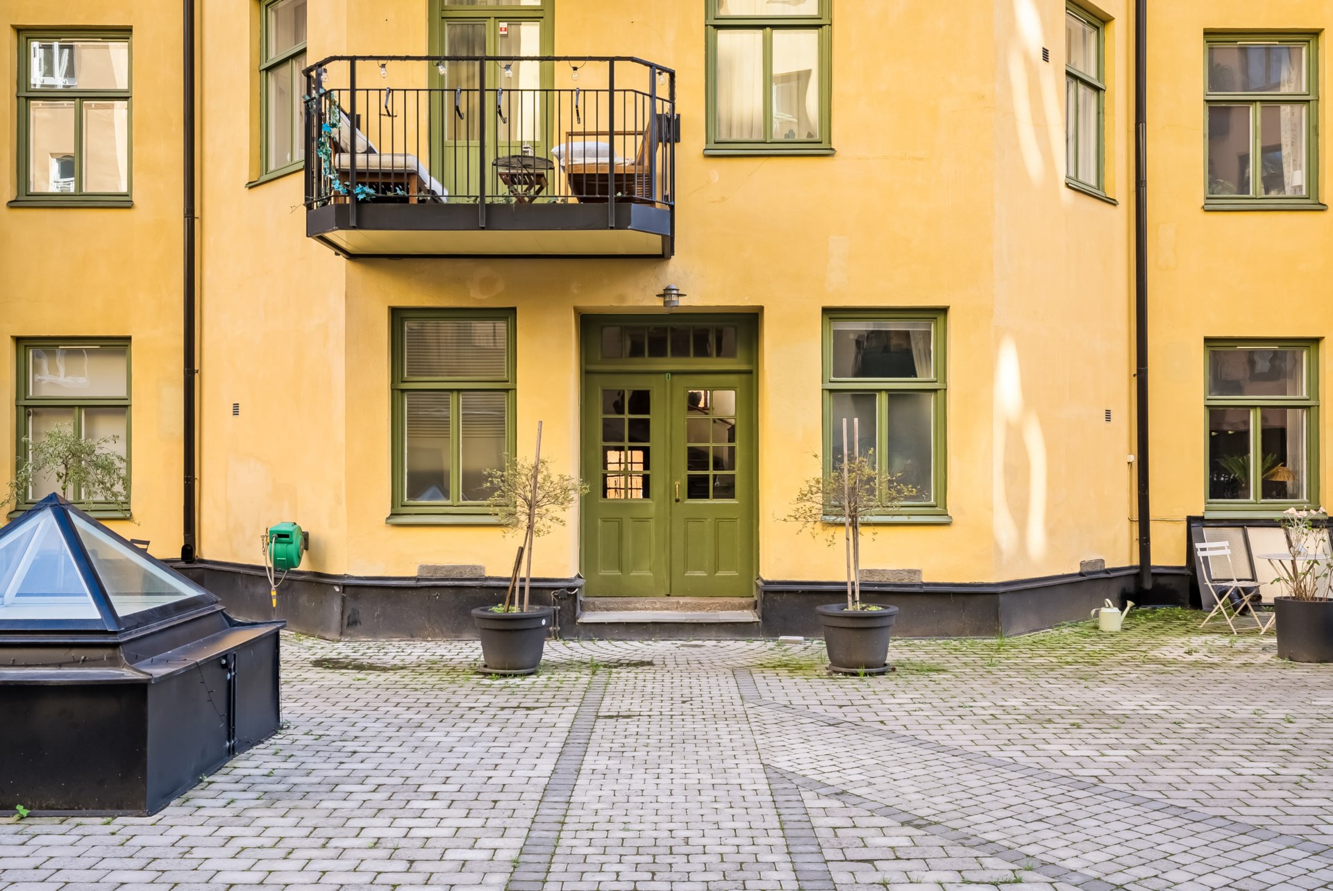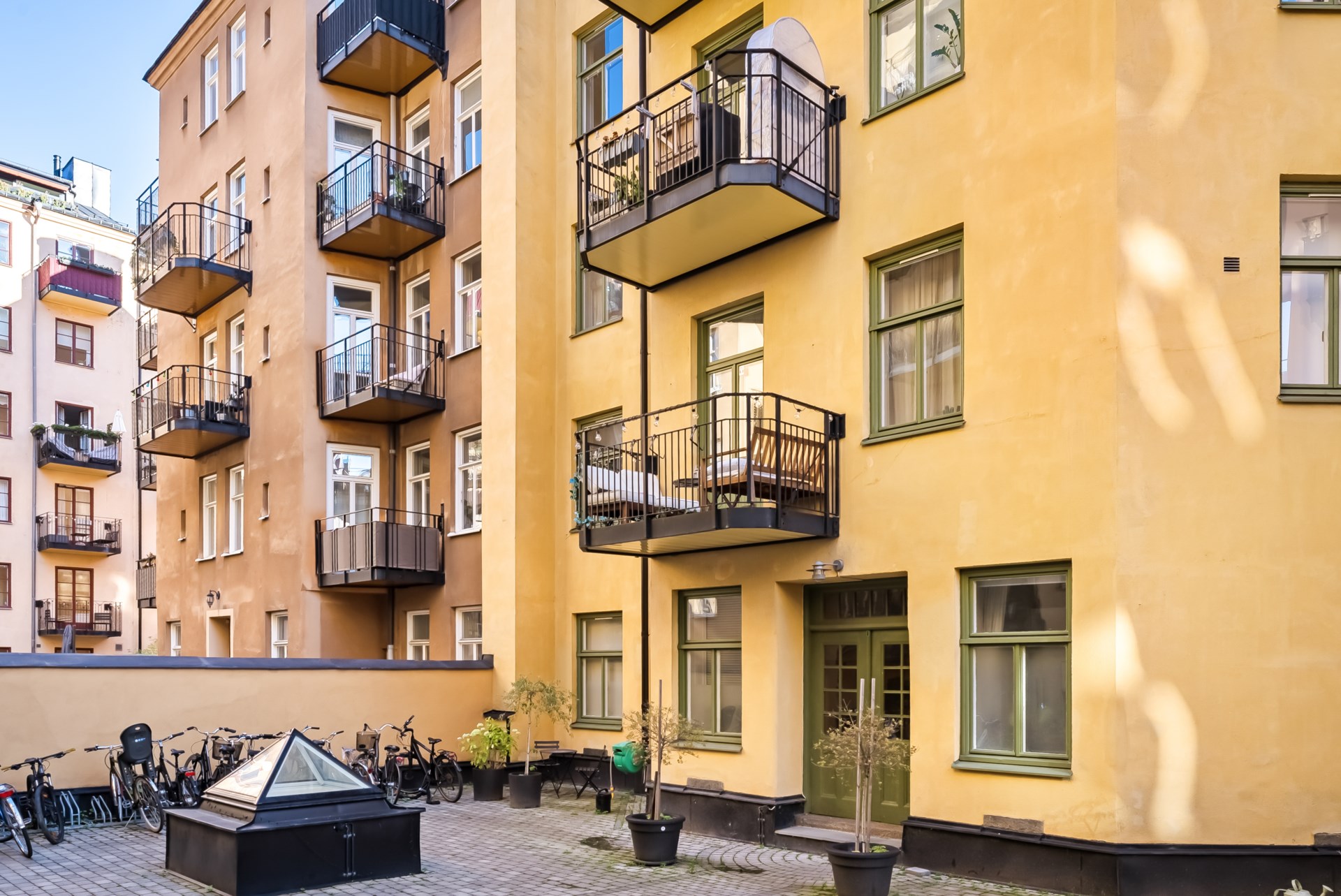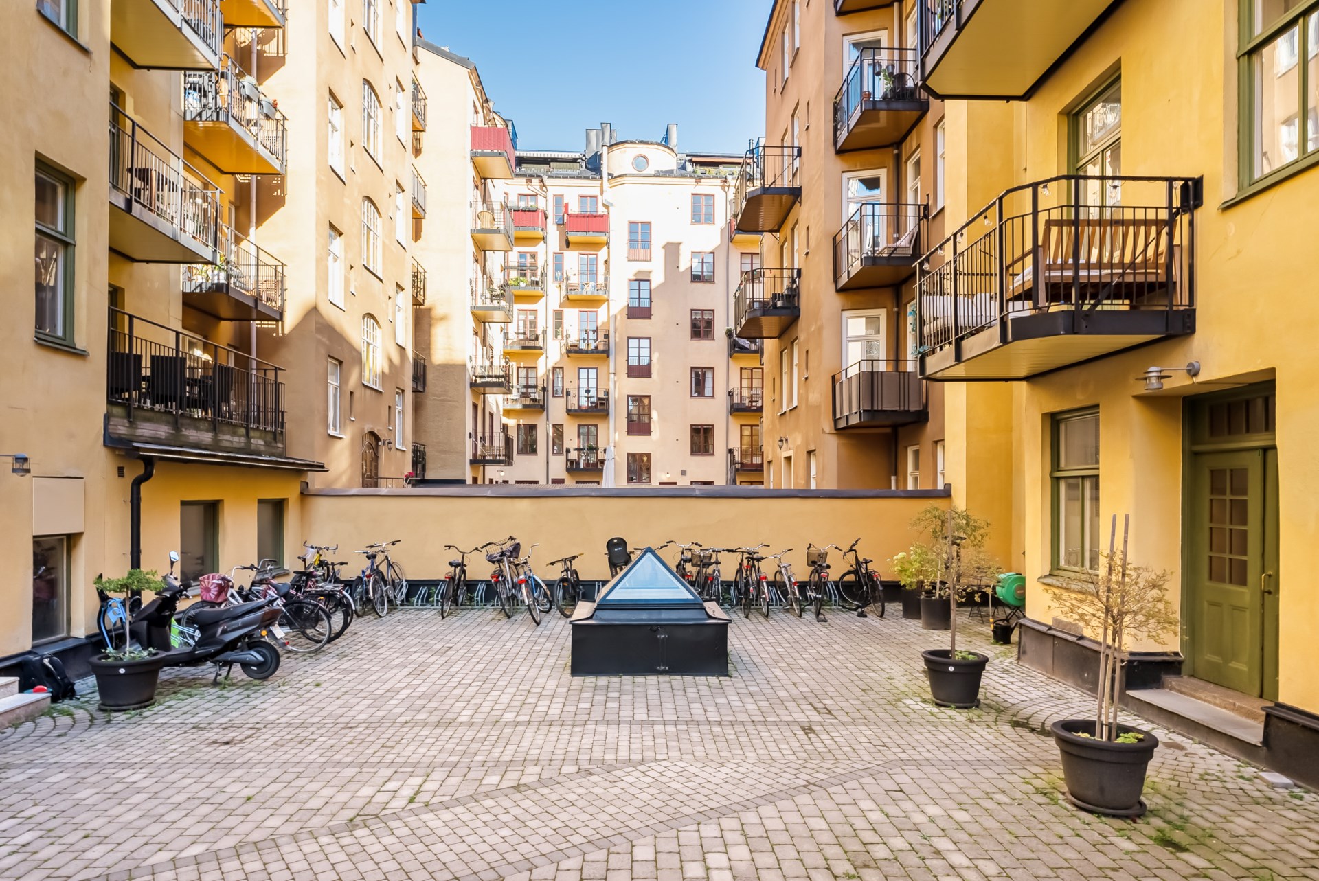 | Gemensamma utrymmen | Cykelställ finns på innergården, dubbla förråd finns tillhörande bostäderna samt tvättstuga finns i gårdshusets källare. Föreningen har en nyrenoverad innergård som under sommartid förses med utemöbler och grill för medlemmar att nyttja. |