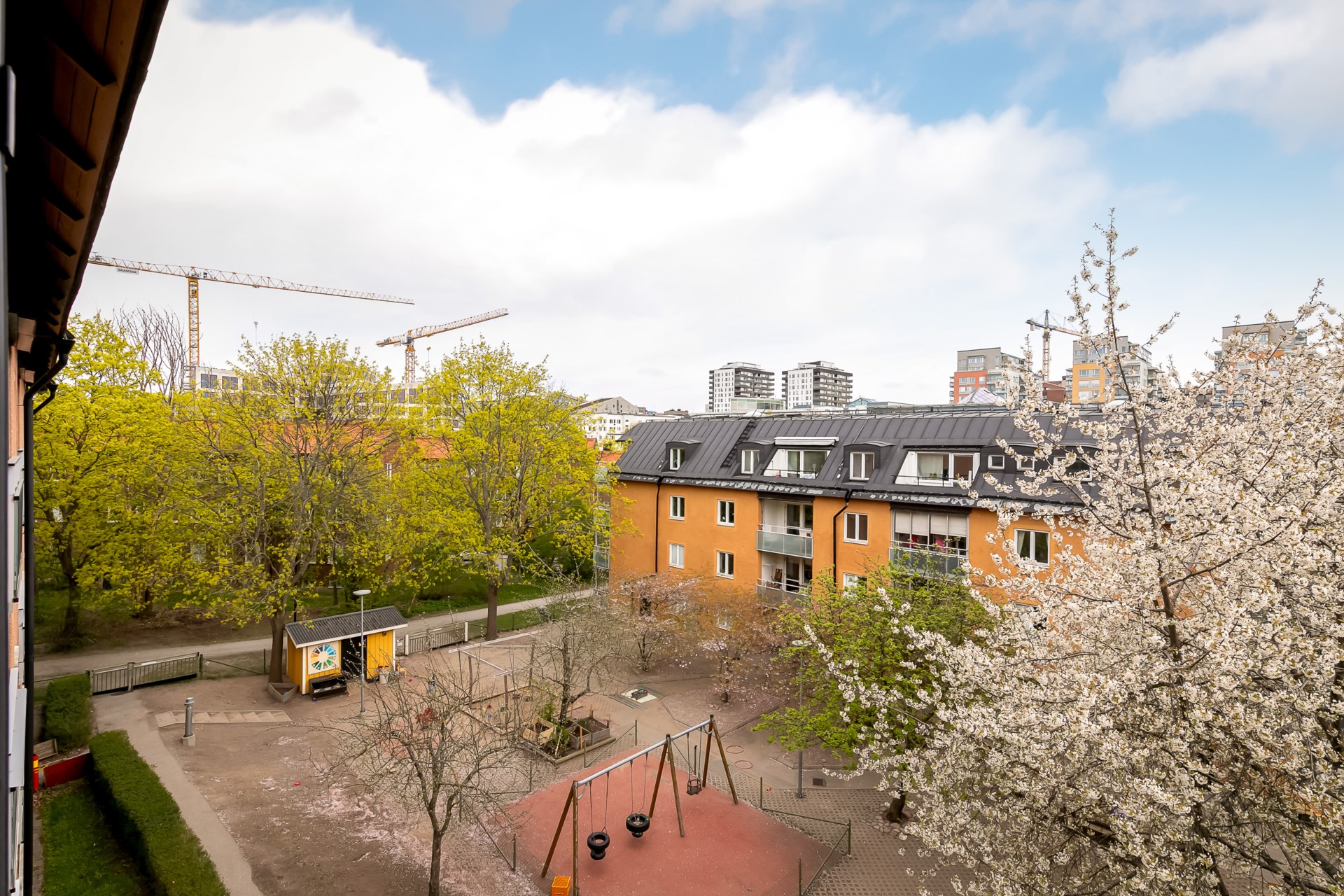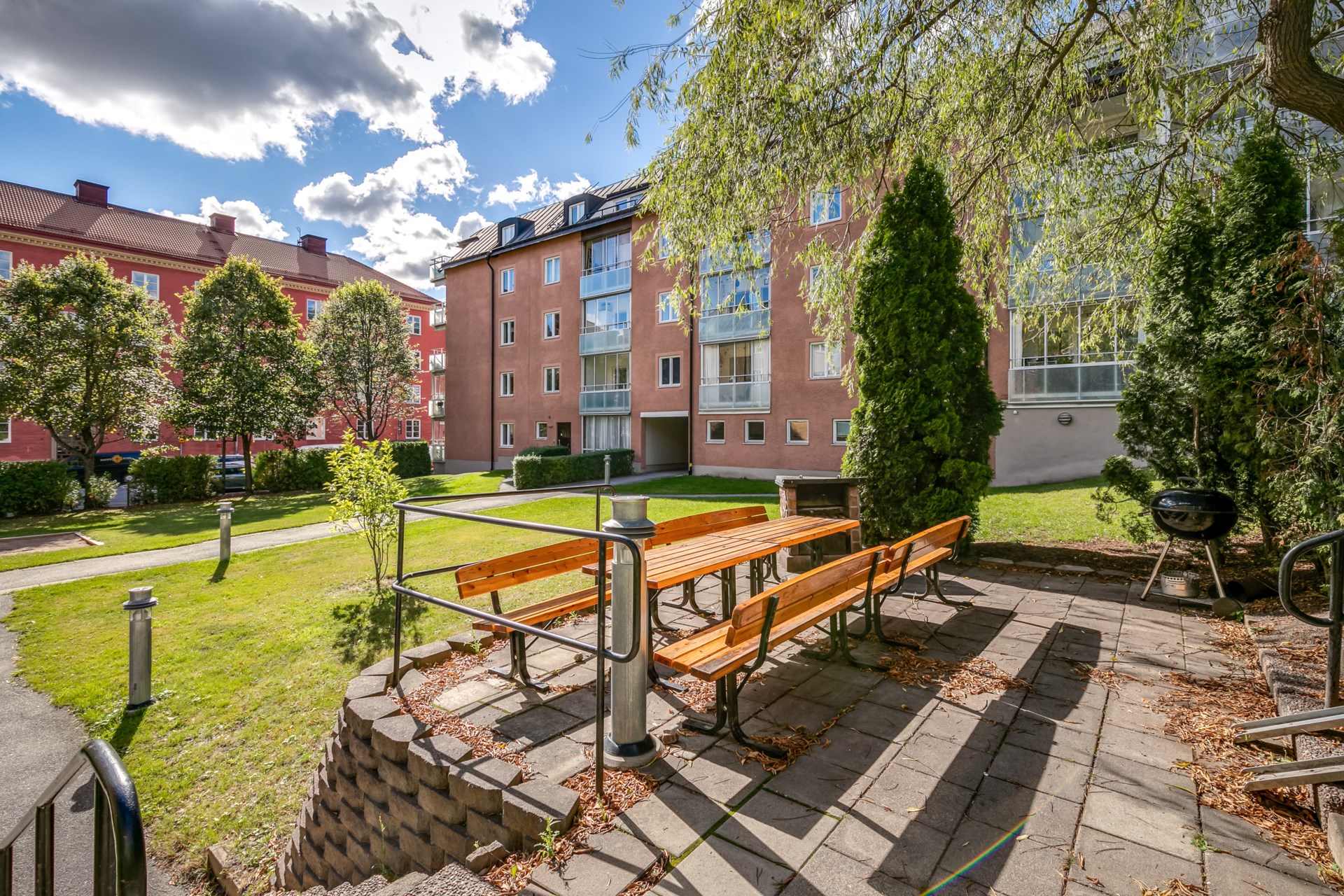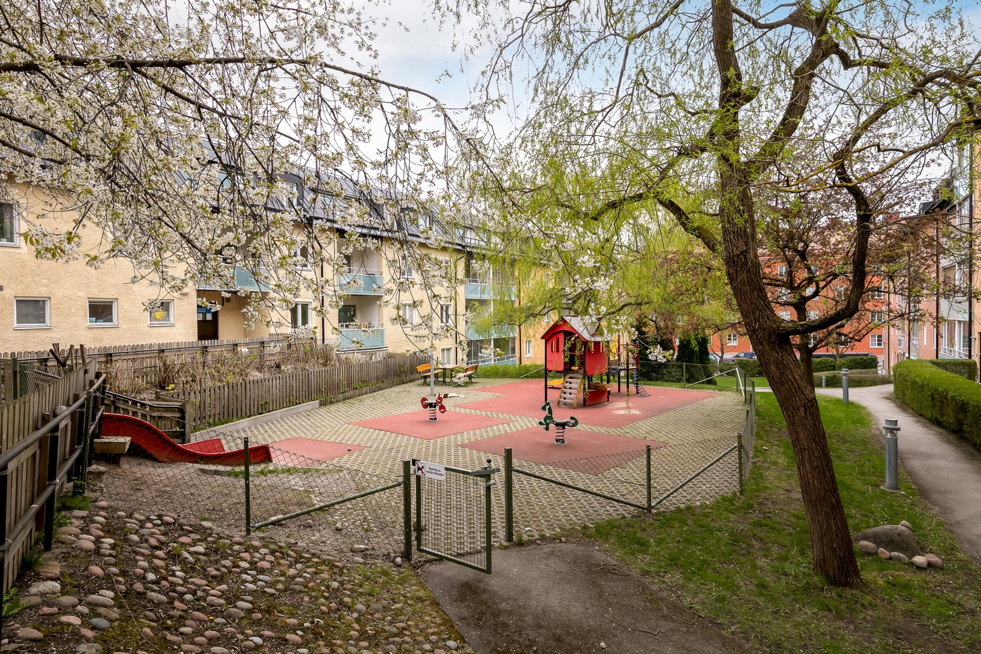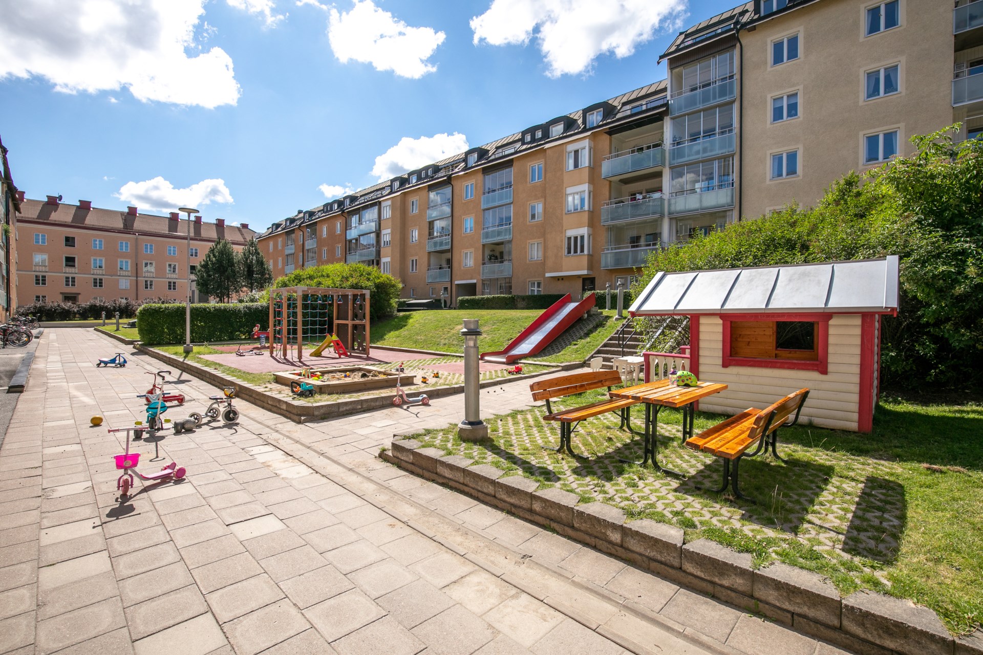 | Gemensamma utrymmen | Gästlägenhet, Fritidslokal, Hobbylokal, Boulebana ,Återvinningsrum Gård med grillplatser och Lekgårdar, Tvättstugor samt rum för barnvagnar och cyklar. |