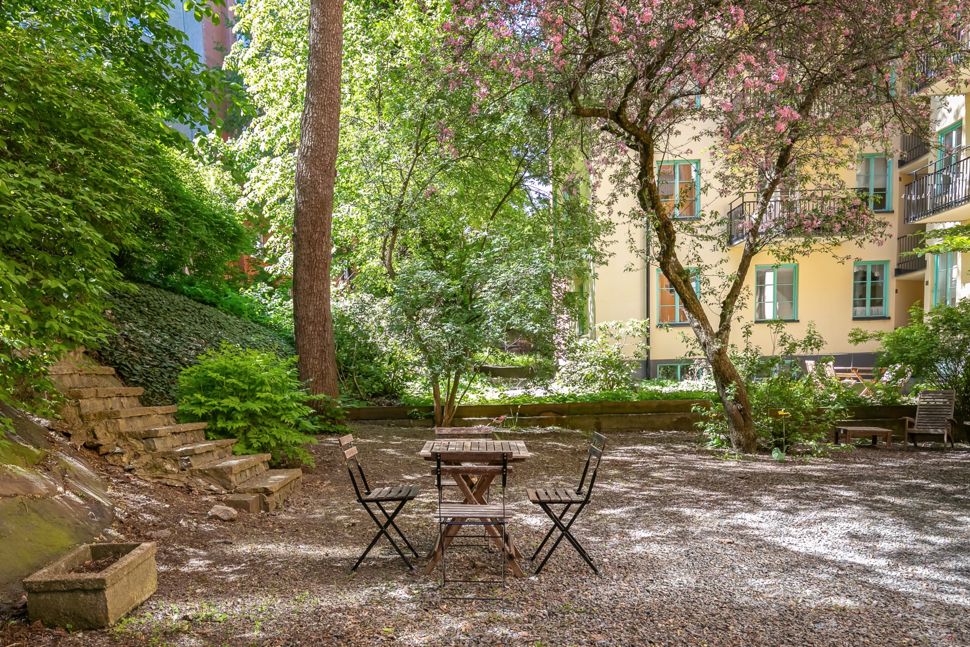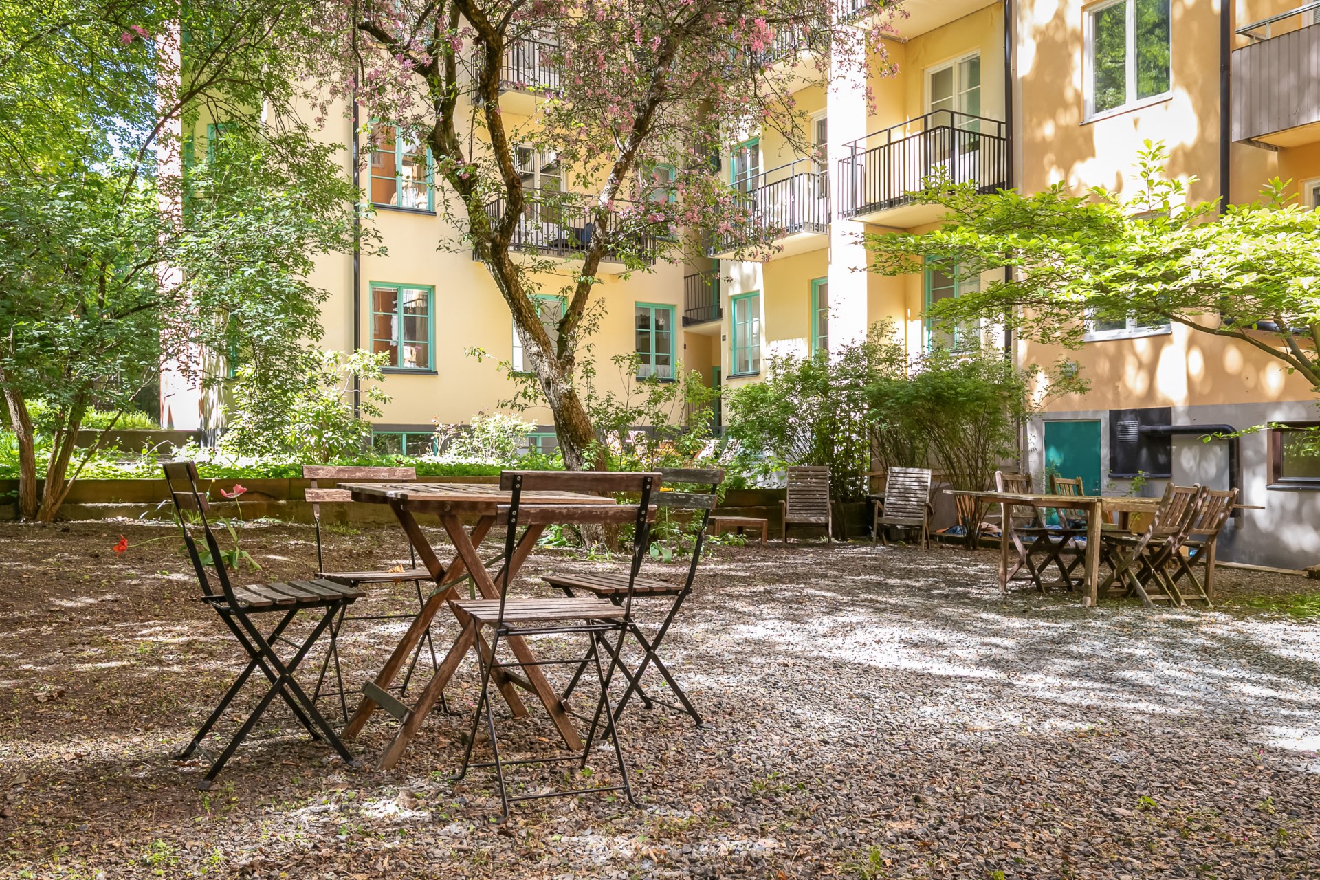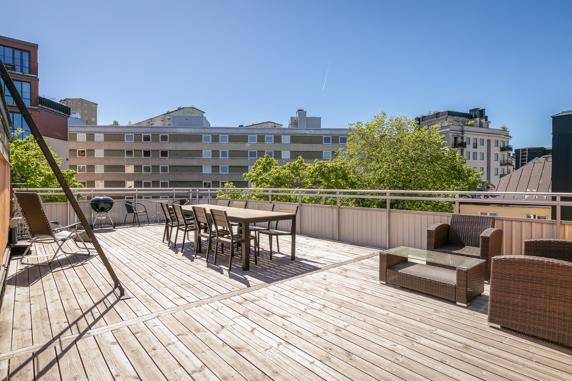| Gemensamma utrymmen | Föreningens gemensamma tvättstuga är belägen på entréplan och är utrustad med två tvättmaskiner, en torktumlare och ett torkskåp. Kombinerat cykel- och barnvagnsrum finns på entréplan. I föreningen finns en härlig takterrass, med sol från morgon till kväll, som är utrustad med trädgårdsmöbler och grill. |
