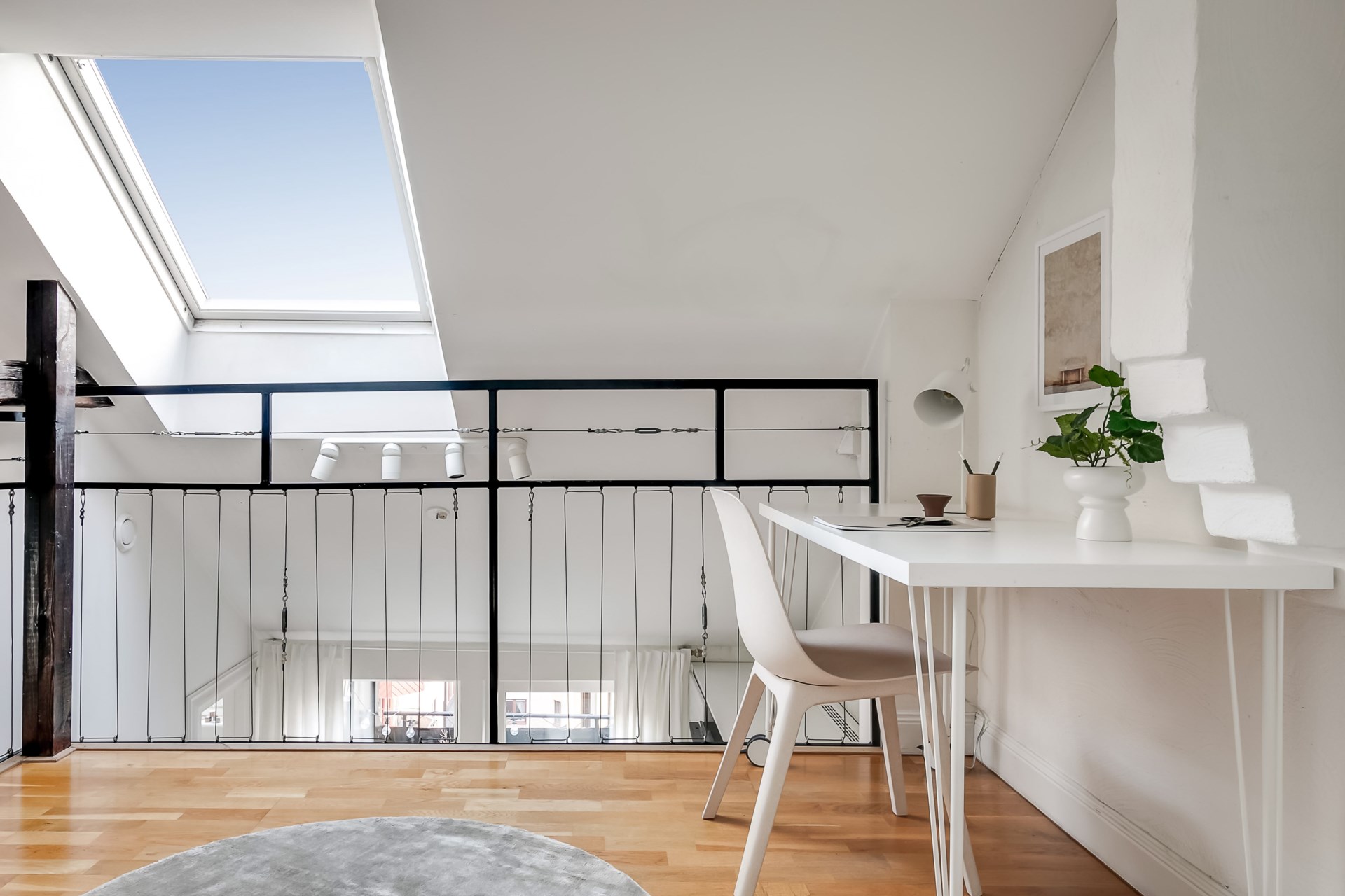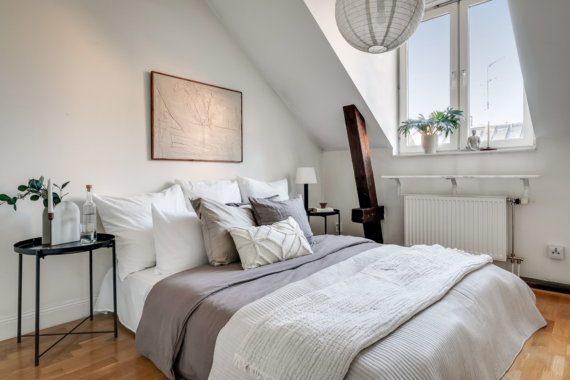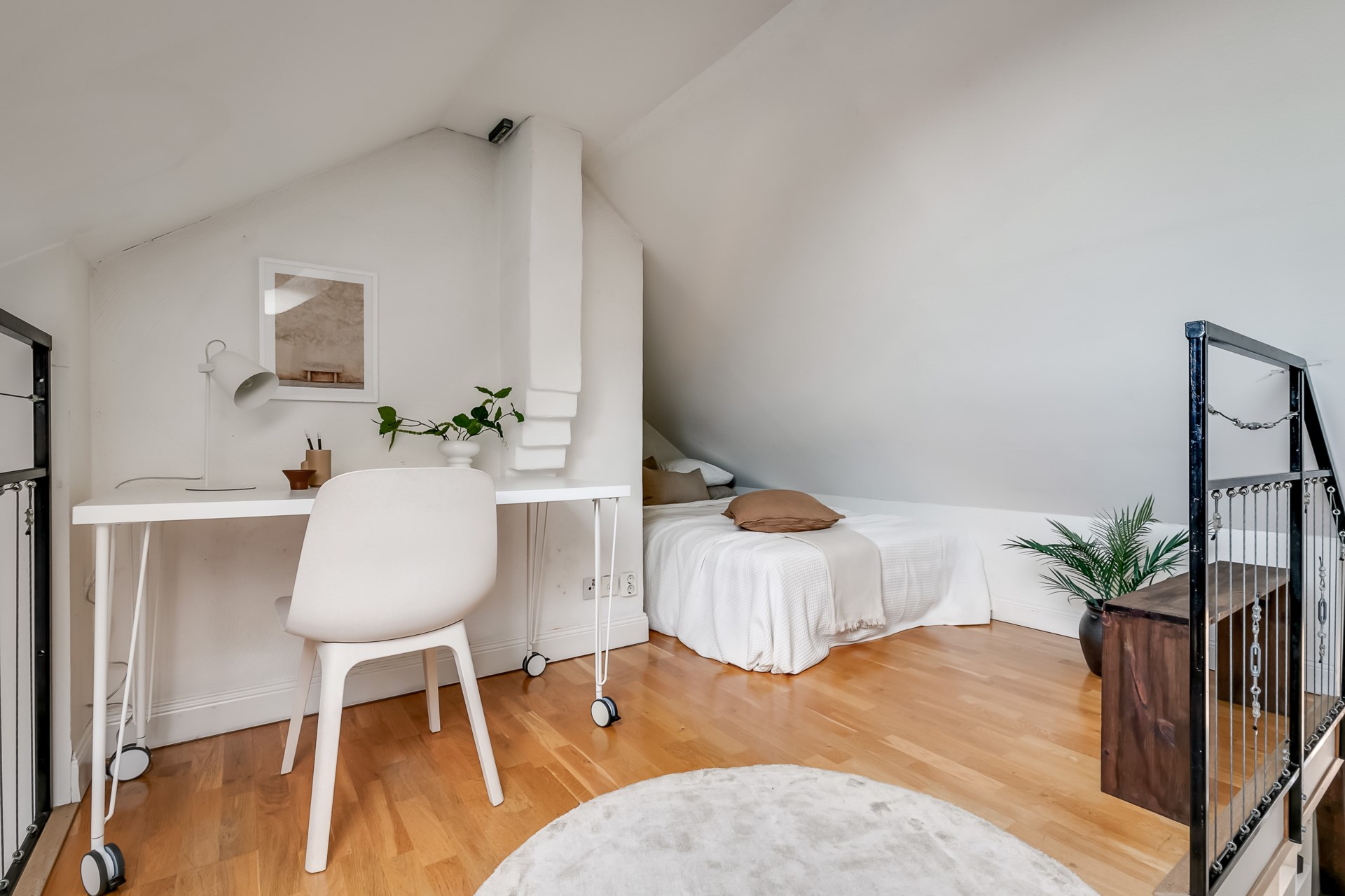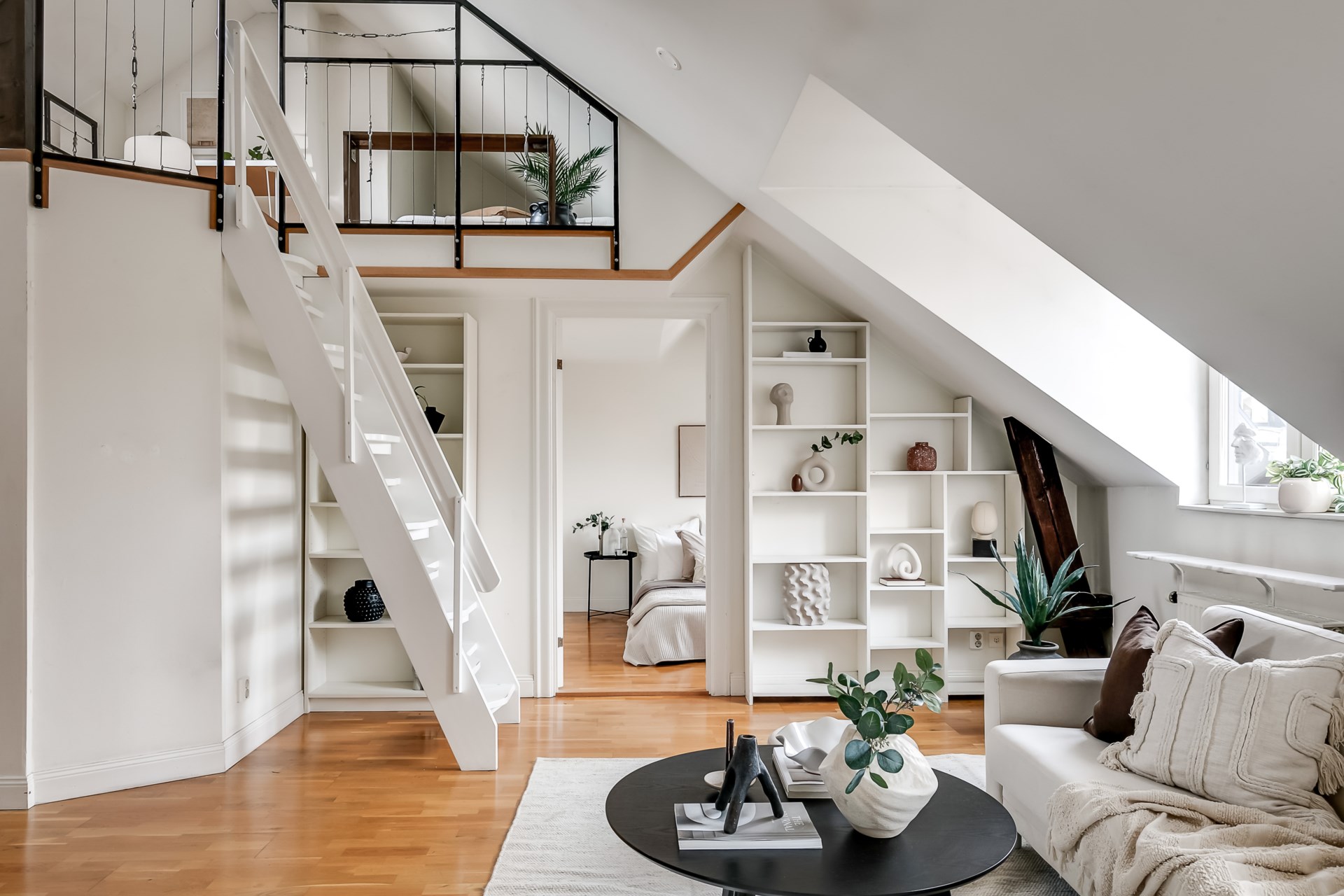 Välkommen till denna unika och luftiga vindsvåning, där karaktärsfulla takbjälkar och en stämningsfull öppen spis skapar en omedelbar känsla av hemtrevnad och stil. Här bor du i en ljus och välplanerad bostad med snedtak, takfönster och