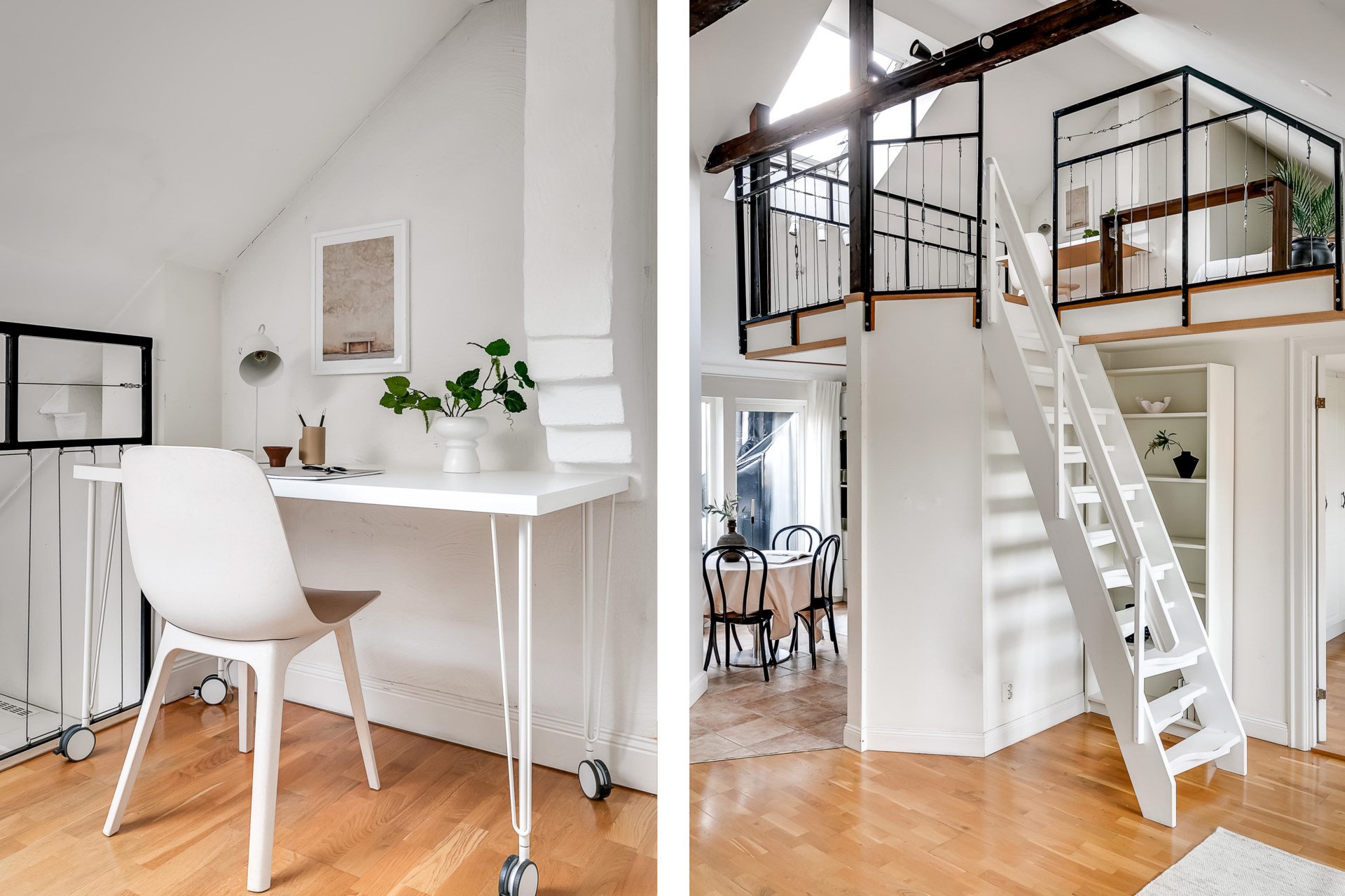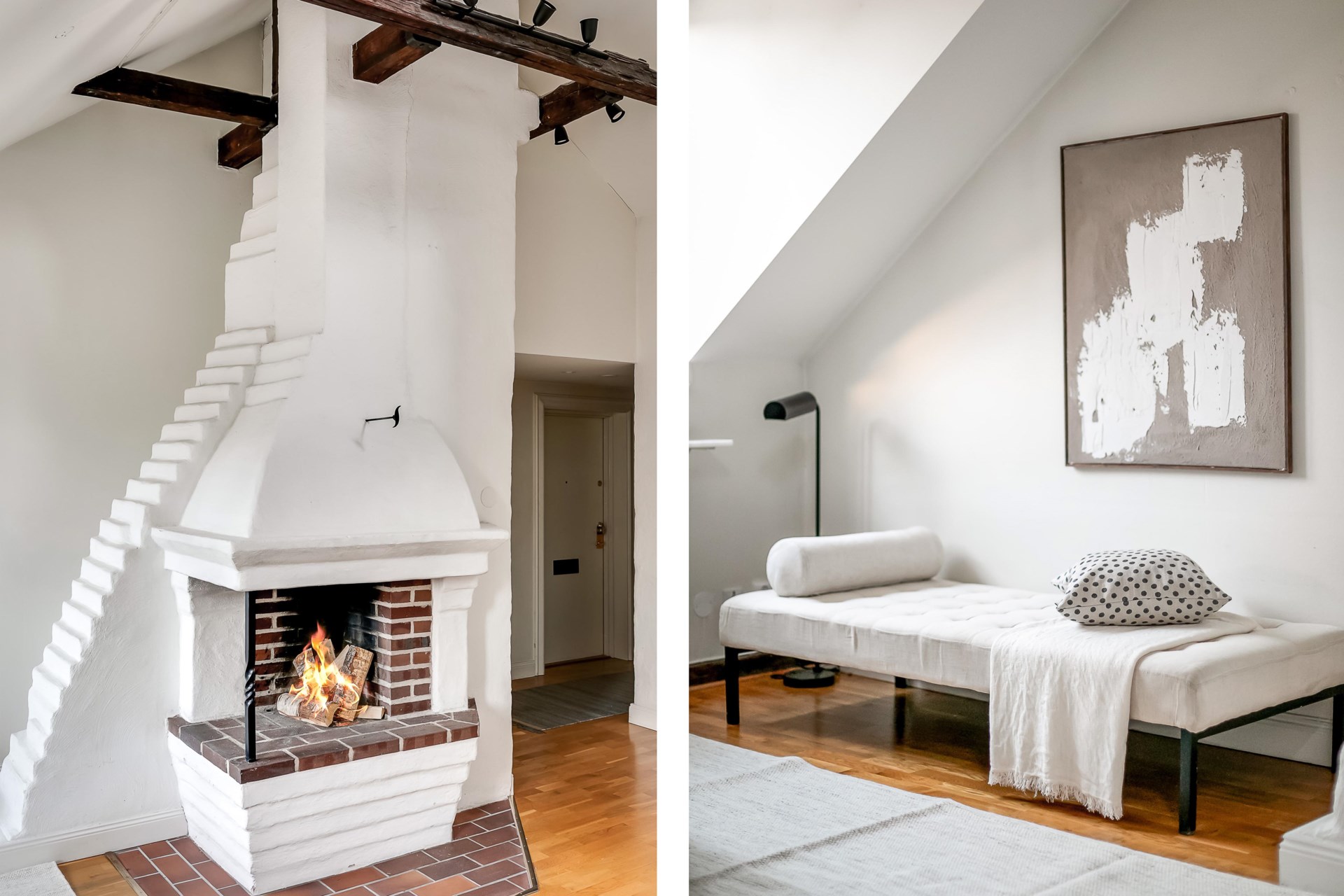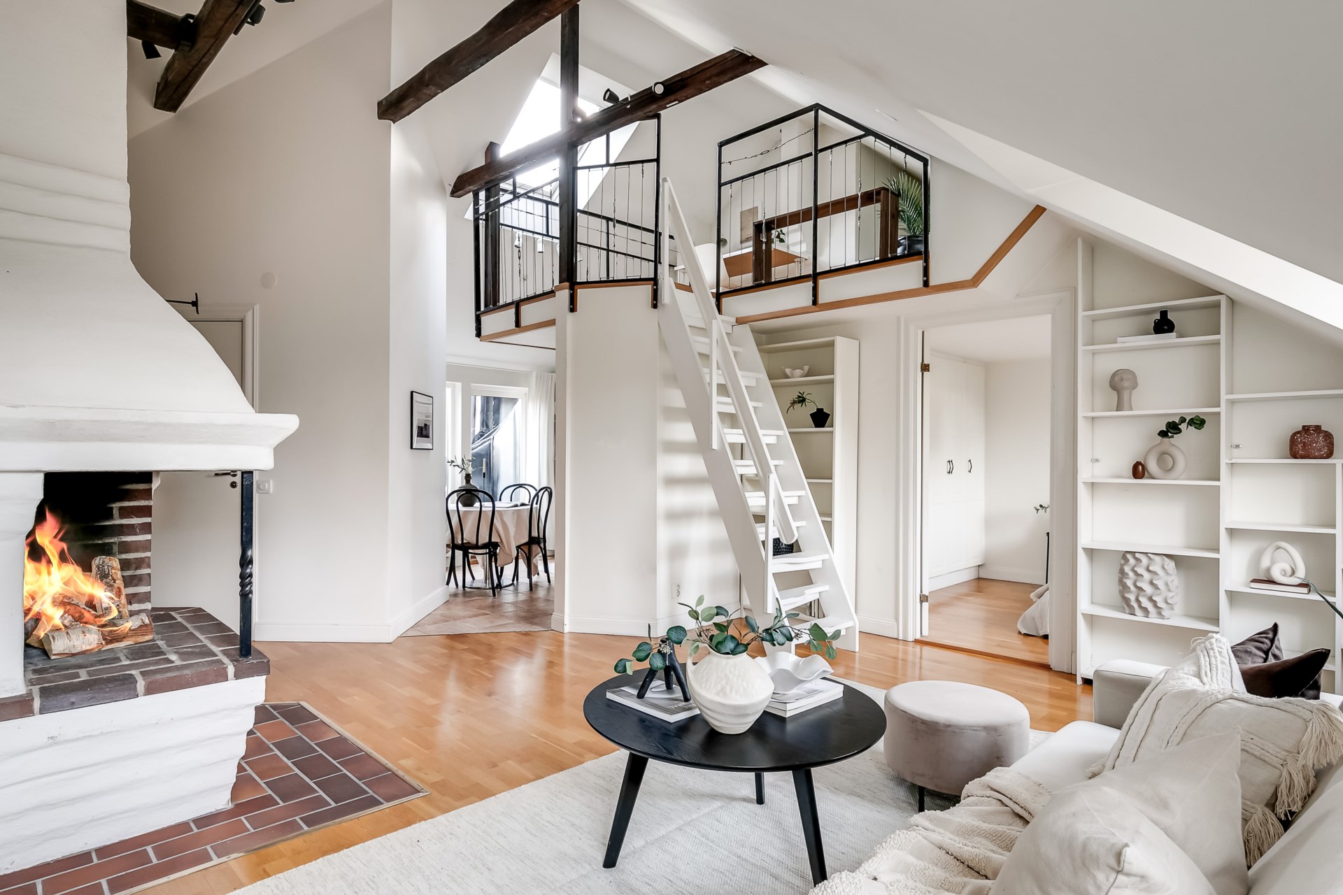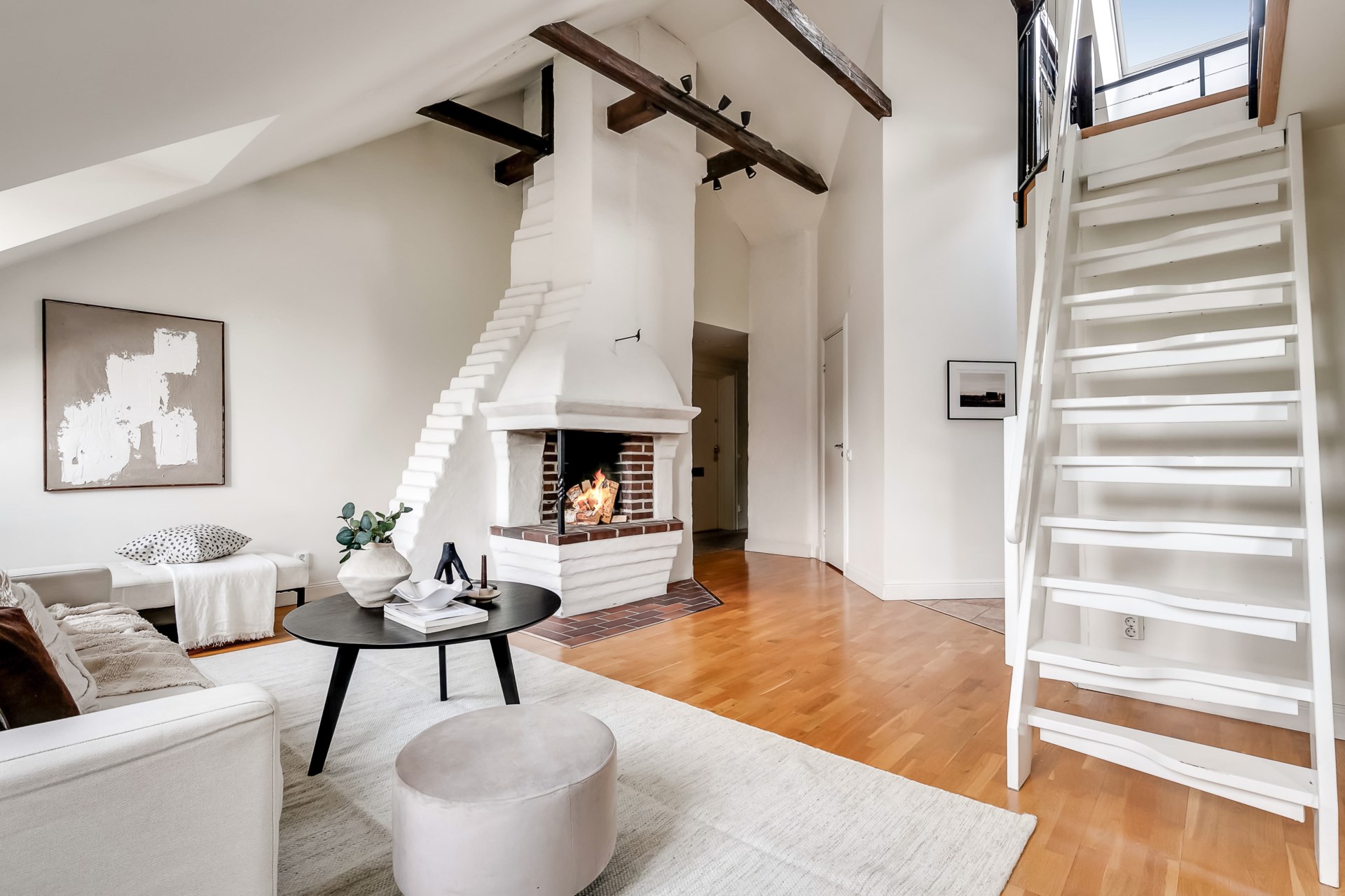 Charmig etagevindsvåning med terrass, öppen spis och takbjälkar – ett hem utöver det vanliga!