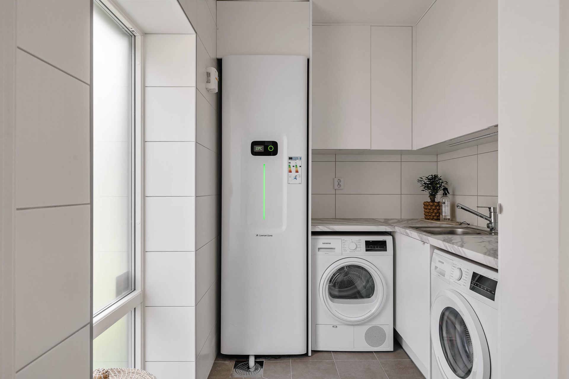 | Uppvärmning | Frånluftsvärmepump med vattenburen golvvärme |