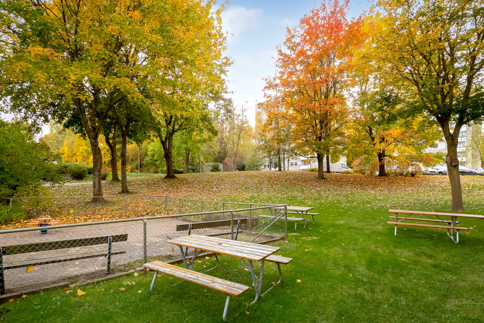 | Gemensamma utrymmen | - Barnvagnsrum - Cykelrum - Grovtvättstuga - Tvättstuga - Lekpark - Gräsytor med bord. |