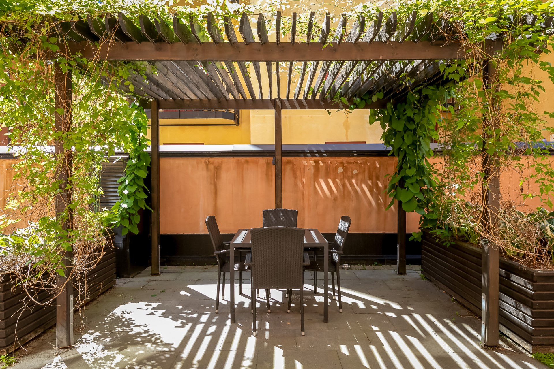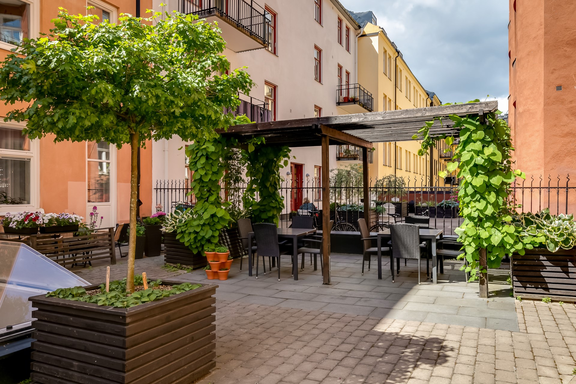 | Gemensamma utrymmen | Gemensammautrymmen är tvättstuga, förråd finns i källare i gathus och vind gårdshus. Föreningen har ett cykel utrymme med tak på en av gårdarna samt pergolor finns på båda gårdarna. |