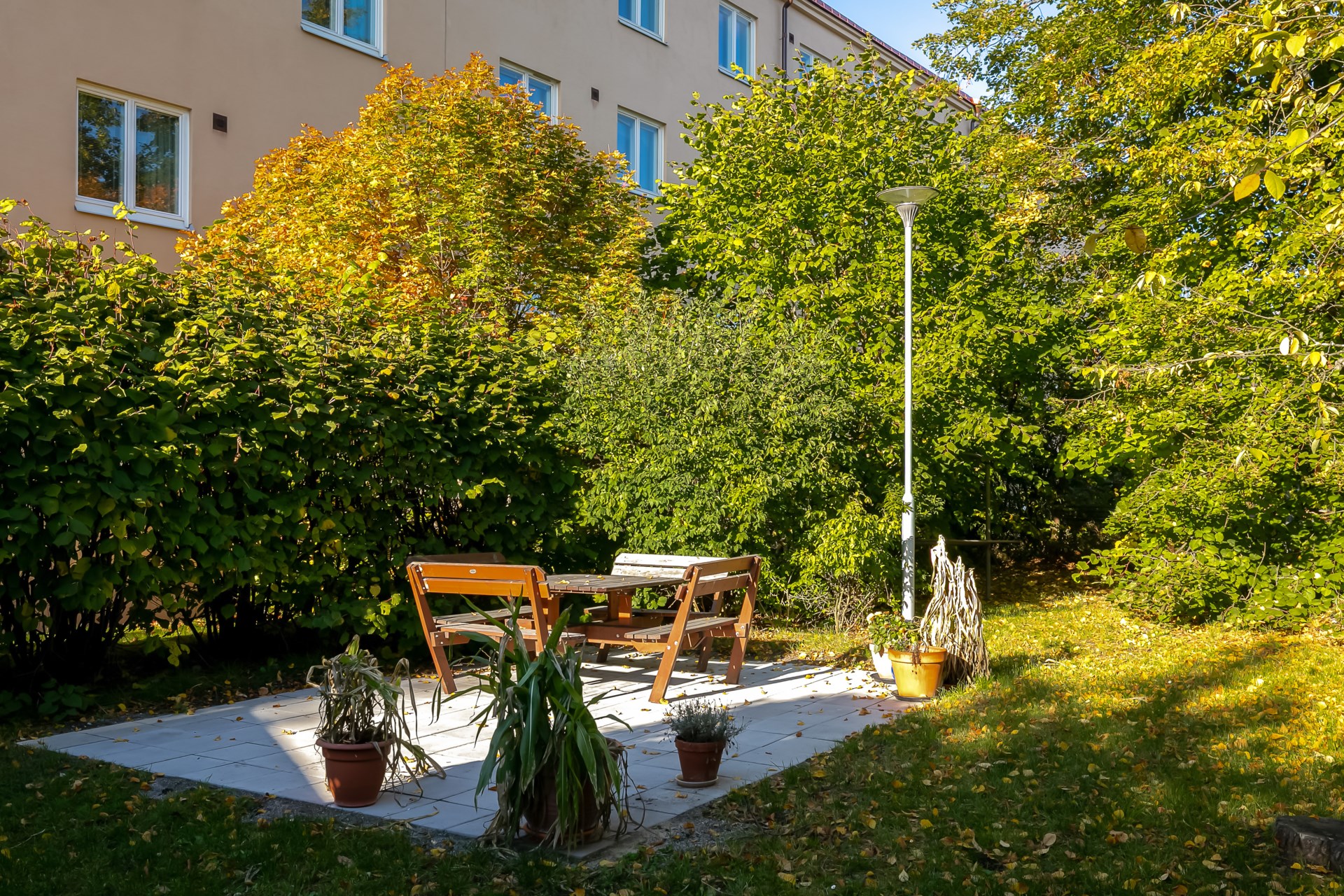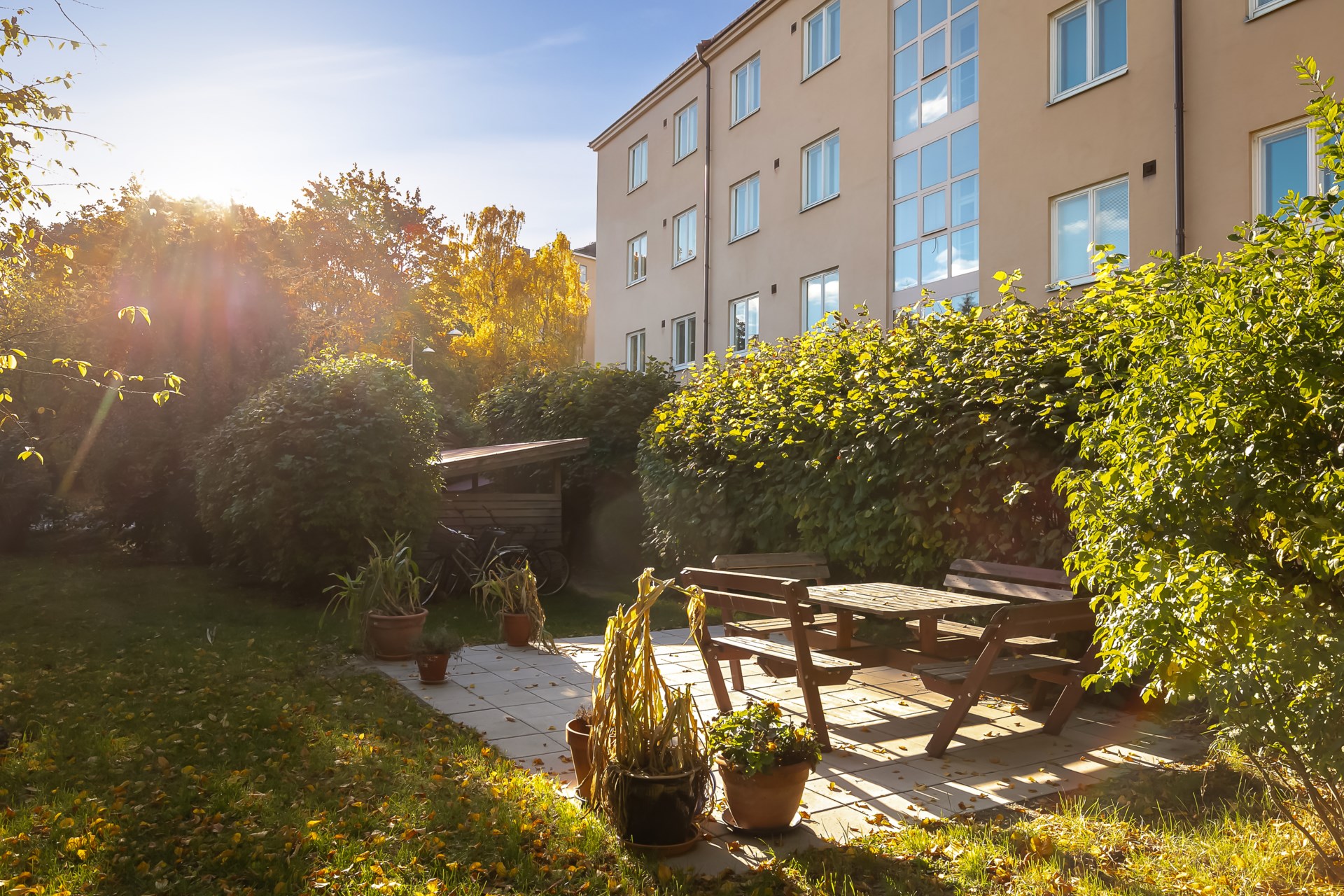 | Gemensamma utrymmen | Föreningen har ett gästrum som kan bokas för en mindre summa. På baksidan, ”innergården”, finns bänkar, bord och grill tillgängligt för medlemmar att utnyttja. Ett gemensamt cykel- och barnvagsrum finns. Föreningen har ett snickar/fixarrum medlemmar kan använda. Där finns bord, snickarbänk och snart en vask. Det finns även en grovdammsugare som medlemmar använder för att städa efter sig. Till varje lägenhet tillkommer åtkomst till eget källarförråd samt åtkomst till tvättstuga och källarförråd. |
