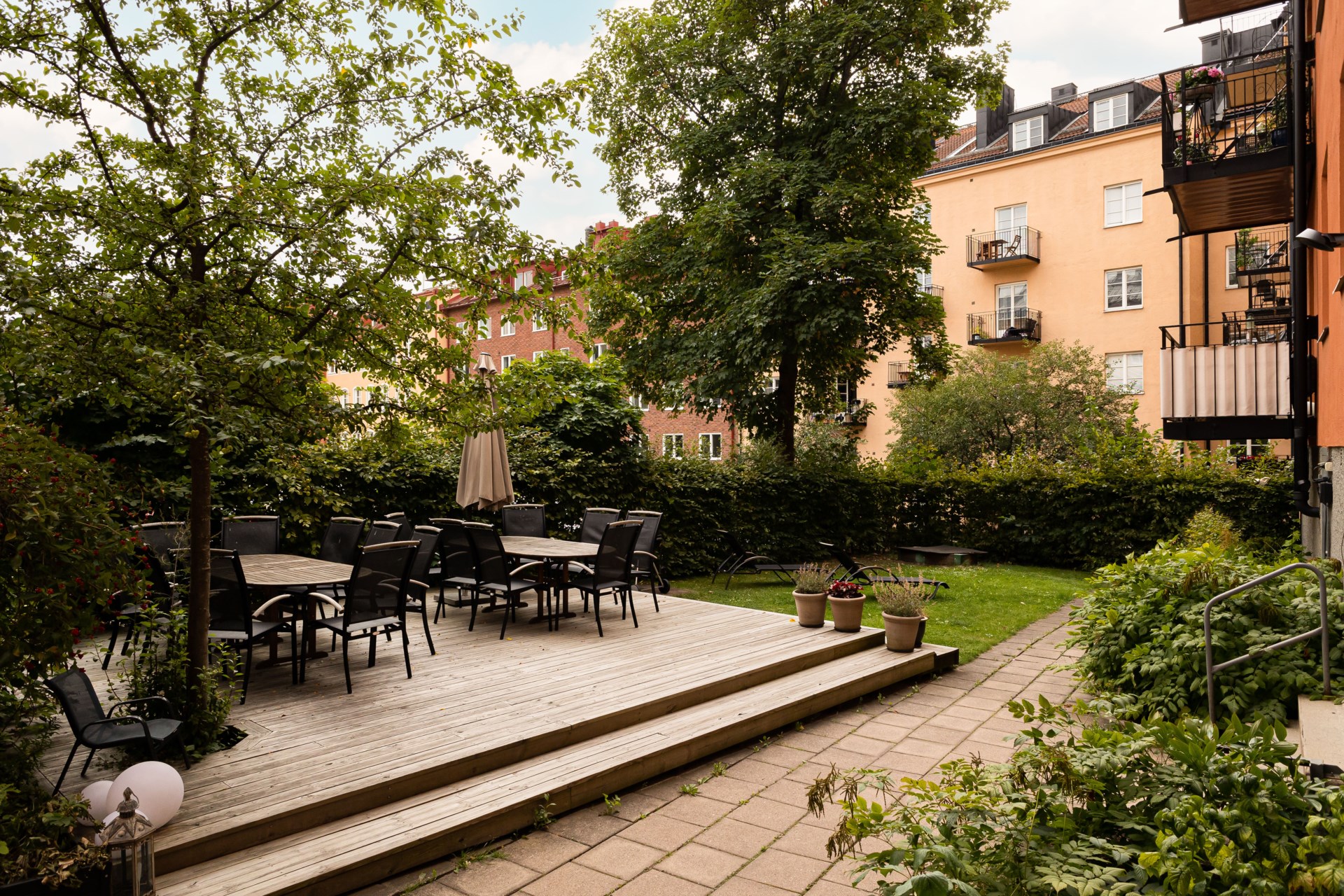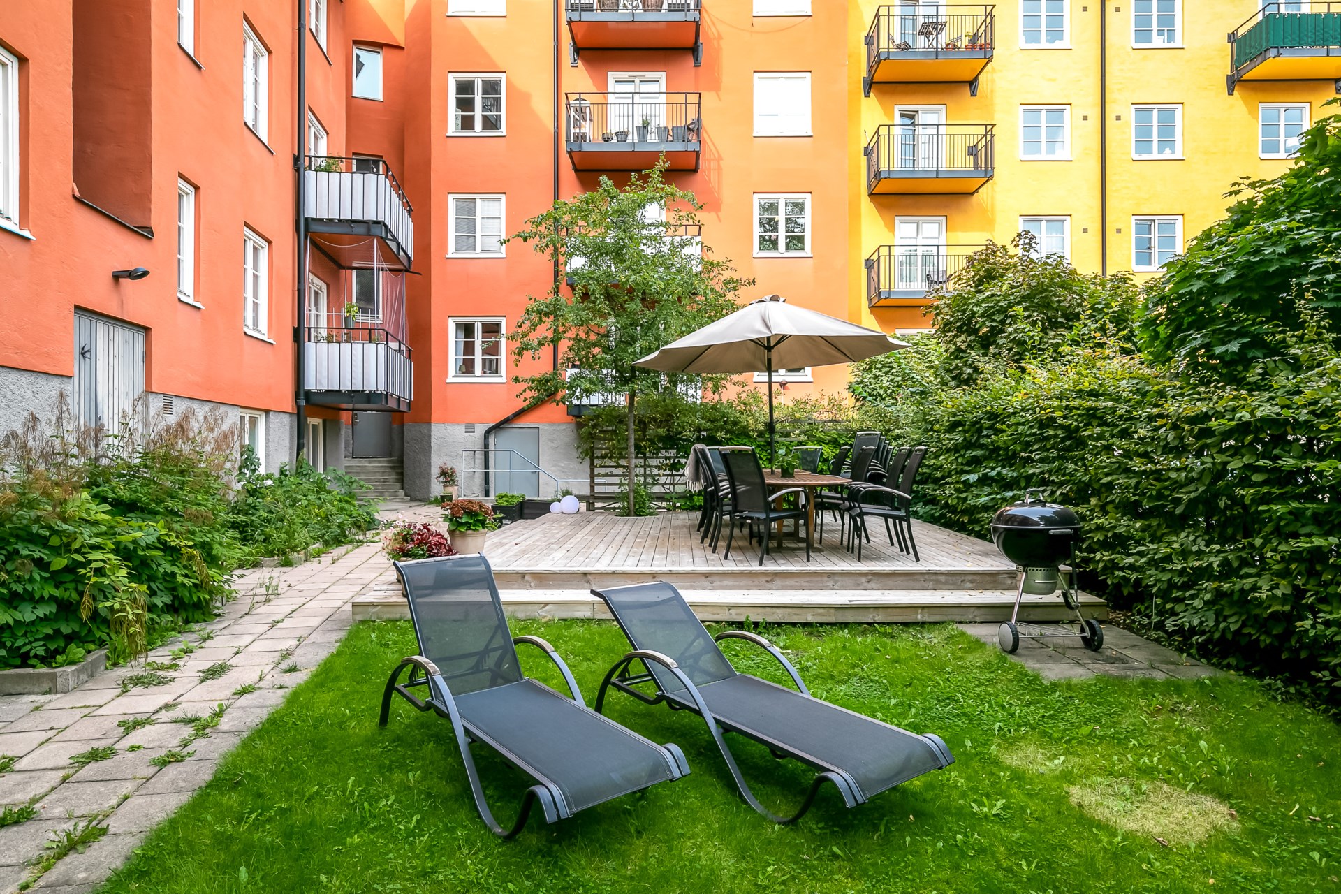 | Gemensamma utrymmen | - Tvättstuga - Styrelserum - Förrådsutrymmen - Cykel- och barnvagnsrum - Grönskande innergård med grillmöjligheter |