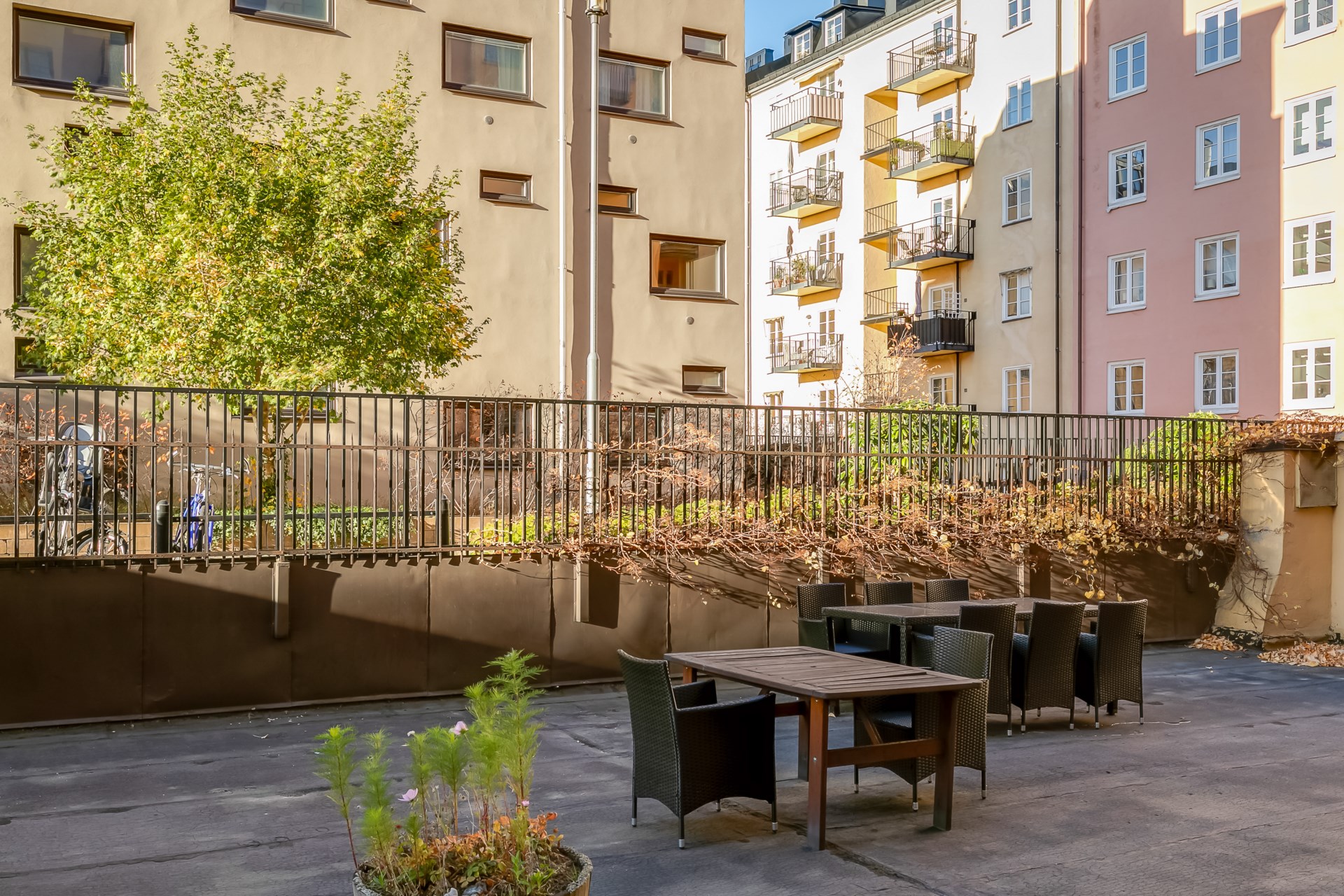 | Gemensamma utrymmen | Tvättstuga (2 st tvättmaskiner, 1 torktumlare), cykelrum, barnvagnsrum, soprum och lokal för möten, snickeri och målning, innergård med grill (kan bokas). |