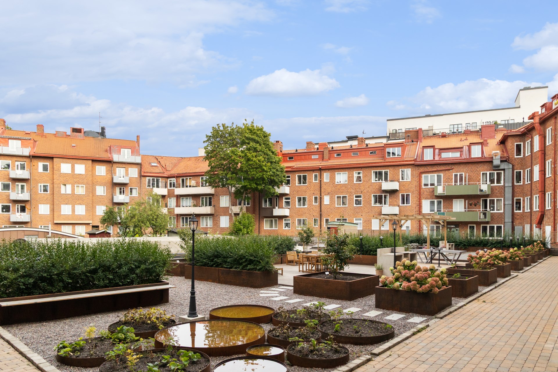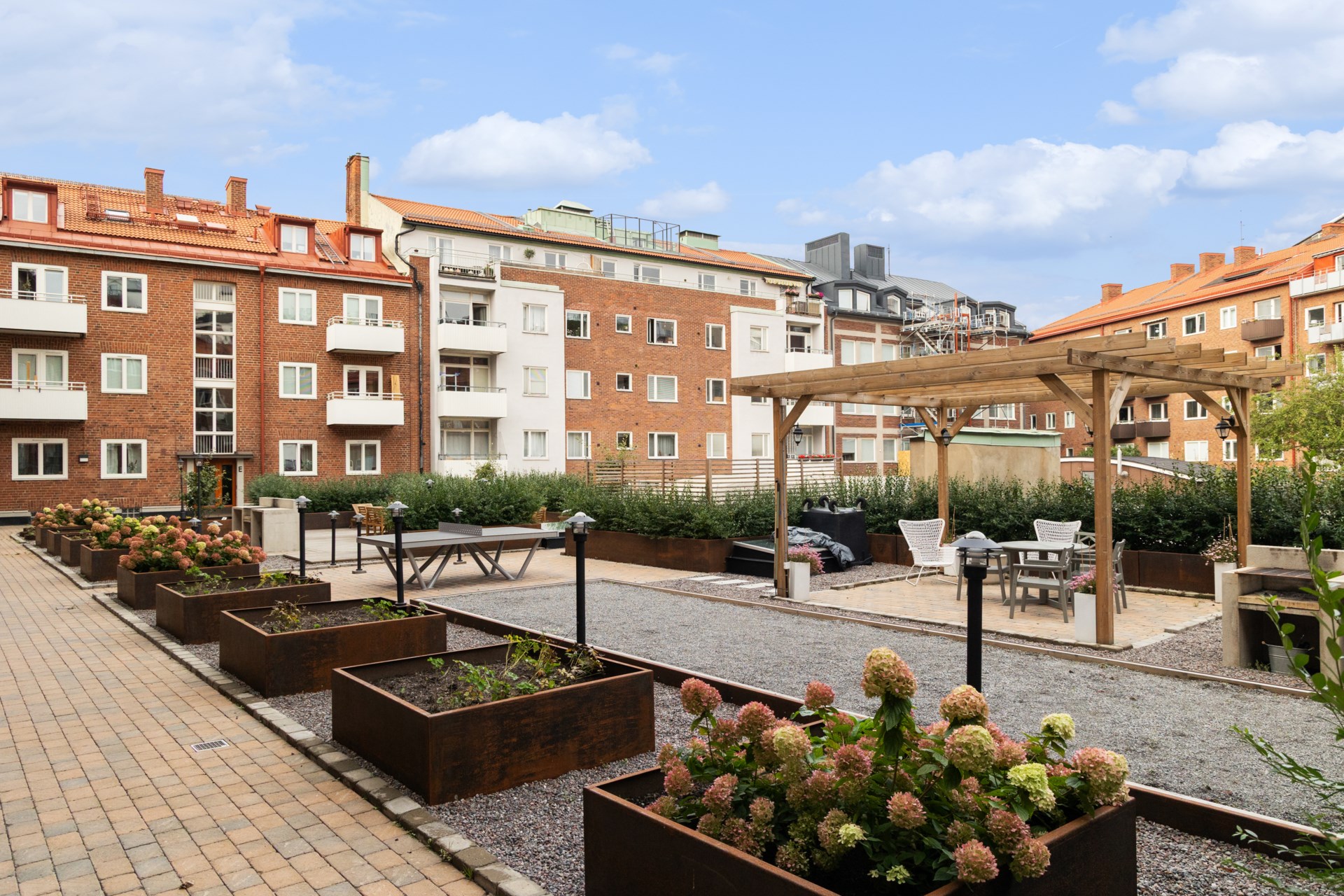 | Gemensamma utrymmen | - Nyrenoverad och stor innergård med bland annat grillmöjligheter, trädäck, pergola, boulebana, pingisbord och massvis av trivsam grönska och belysning - Två nyrenoverade tvättstugor (en stor och en mindre) med elektronisk bokning - Nyrenoverat och modernt cykel- och barnvagnsrum - Nytt utrymme med nya och moderna sophus för mat och restavfall - Källarförråd tillhörande varje lägenhet |