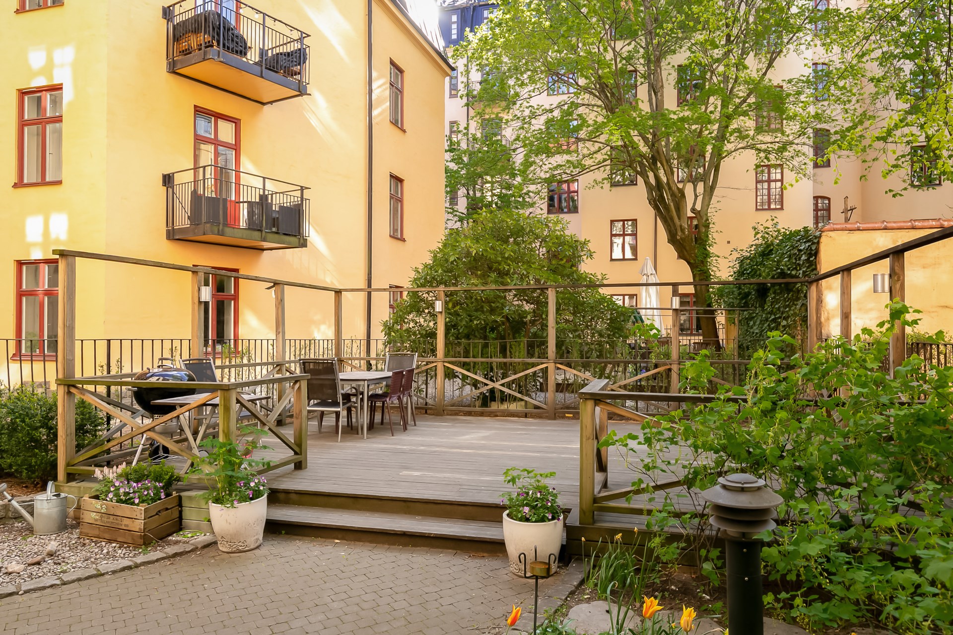 | Gemensamma utrymmen | Innergård med utemöbler och grillmöjligheter, cykelförvaring, barnvagnsförvaring i källaren under b-porten. Tvättstuga (källare B-hus) utrustad med två tvättmaskiner, två torkskåp, torktumlare och mangel, belägen i gårdshusets källare, direkt access via hiss. |
