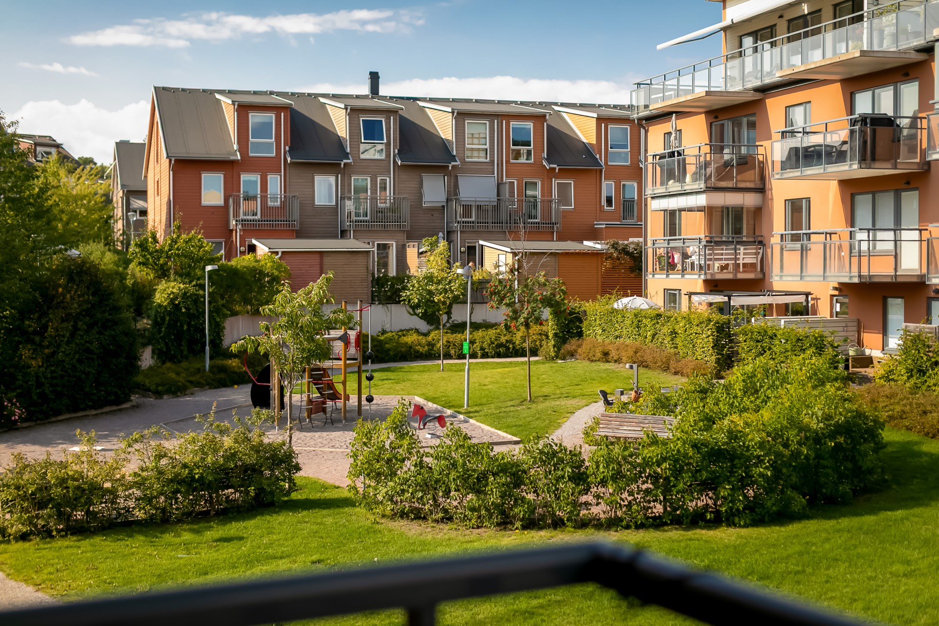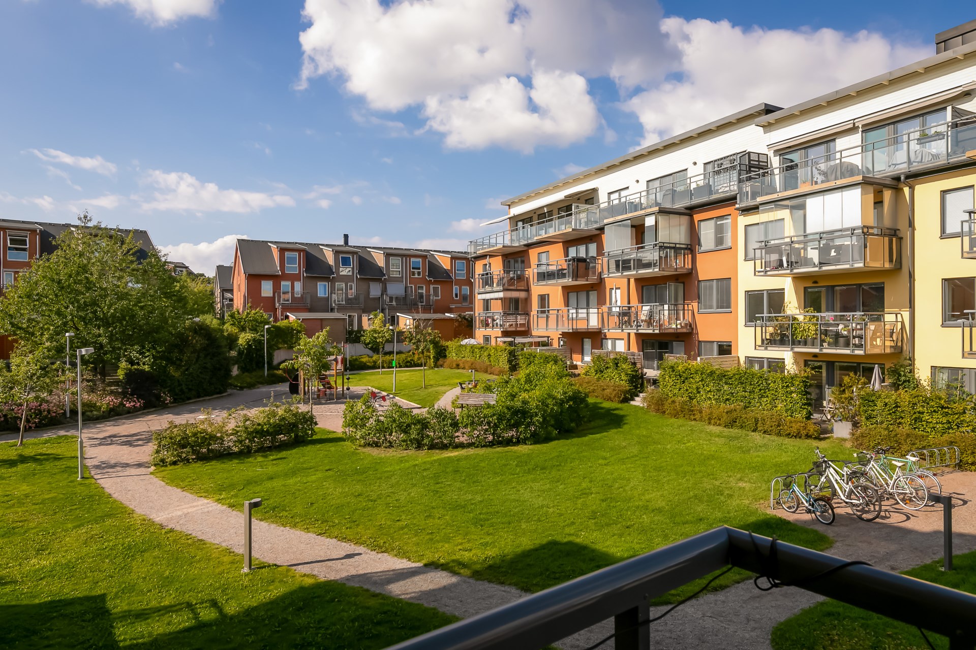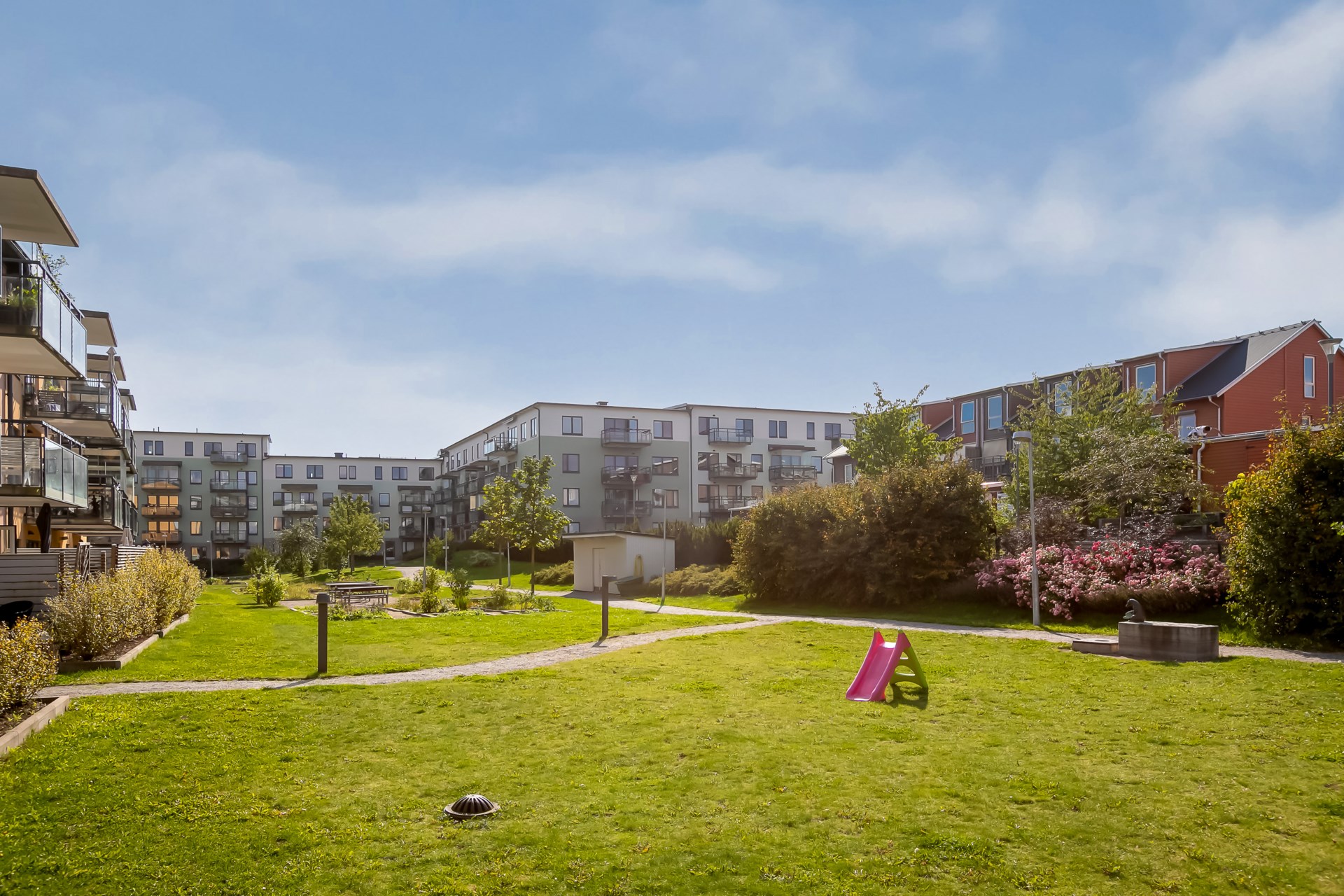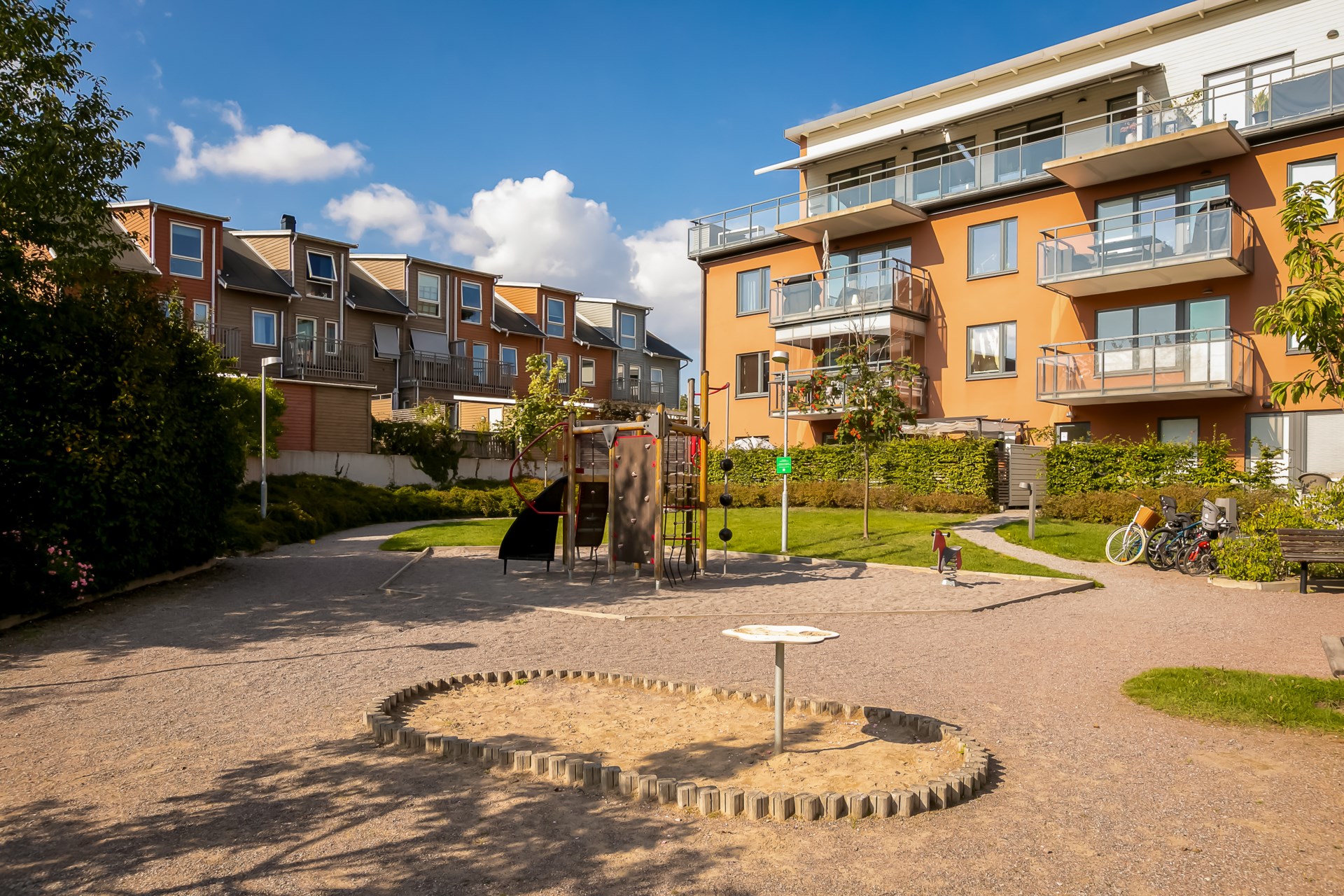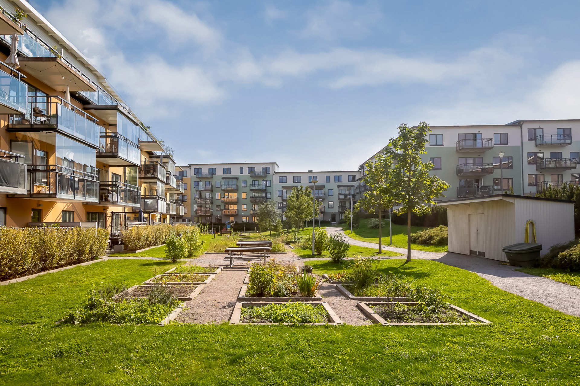 | Gemensamma utrymmen | På de gemensamma gårdarna finns två lekplatser samt ett antal odlingslotter för de boendes egen plantering. I bostadsrättsföreningen finns det en föreningslokal/övernattningslägenhet och en grovtvättstuga. I varje trapphus finns det cykel- och barnvagnsförråd. För hushållssopor finns utvändiga markkärl och ett källsorteringsrum. |